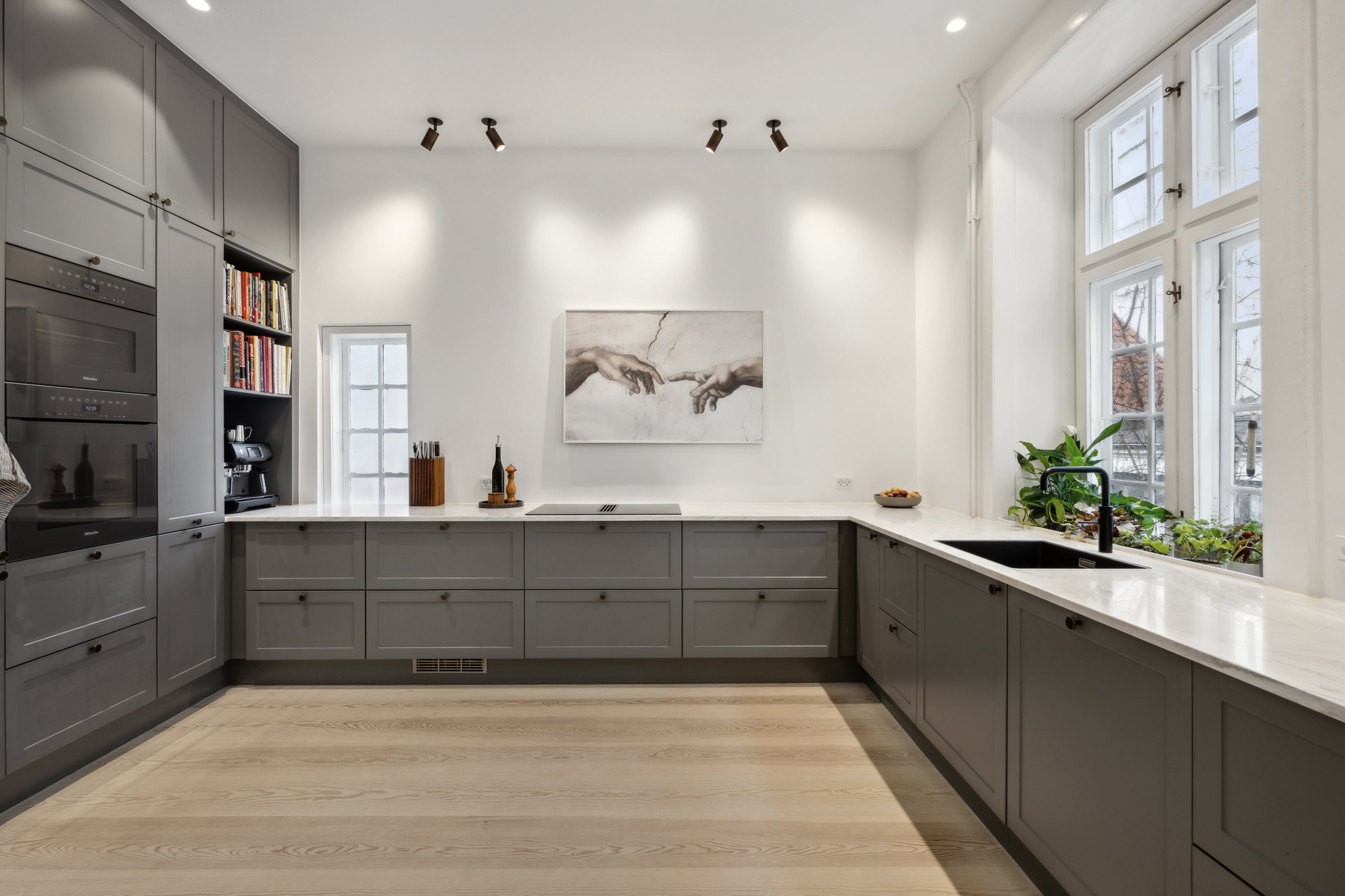Denne eksklusive liebhaverlejlighed er beliggende i eftertragtede Frederiksstaden midt i København, hvor I er tæt på alle byens muligheder såvel som dagligdagens faciliteter. Her er tale om en smuk renoveret lejlighed, hvis veludnyttede planløsning giver gode indretningsmuligheder for parret eller familien - og hvor der tilmed medfølger to private parkeringspladser. Ved ankomst til boligen bemærker I straks den lyse og indbydende atmosfære, som særligt skyldes de rige mængder dagslys, der strømmer ind gennem sprossevinduerne. Inden døre råder hjemmet over 201kvm, og takket være renoveringen står lejligheden helt nutidig og i et smagfuldt design med fine herskabelige detaljer såsom radiatorskjulere, høje vægpaneler og en flot loftshøjde. I hele lejligheden er der flotte lyse Dinesen-planker og lejligheden har derudover nye elinstallationer. Lejlighedens kvadratmeter fordeler sig over et stort køkken, to stuer, tre værelser, et badeværelse og et gæstetoilet. Til venstre for den klassiske fordelingsentré træder I direkte ind i det, der for nuværende er indrettet som dagligstuen. Derfra er der adgang til to rummelige soveværelser med gavmilde lysindfald fra sydøst. Videre møder I spisestuen, hvor loftshøjden på over tre meter bidrager til en fantastisk rumfornemmelse. Gangarealet leder jer forbi det tredje soveværelse med garderobe og gæstetoilettet mod det nye, smagfulde køkken. Her får I gode opbevaringsmuligheder samt alt i hårde hvidevarer - herunder en stor induktionskogeplade med indbygget emfang, to ovne, Quooker med boblevand og et vinkøleskab. Ydermere er der plads til et stort spisebord i køkkenet, hvor hele familien kan samles. Endelig skal I se det eksklusive badeværelse med italienske baderumsmøbler, specialbygget Poliform skab med vaske-/tørremaskine, topmonteret håndvask og Vola-armaturer, der giver badeværelset et strejf af luksus. Lejligheden er placeret på første sal i en smuk, klassisk københavnerejendom fra 1750 skråt overfor Marmorkirken. Helt unikt medfølger to tinglyste parkeringspladser til lejligheden, som man har let adgangtil via gården. Ude på gaden ligger København for jeres fødder, og det tager ikke mange minutter at spadsere til lige det, I ønsker jer. Det praktiske kommer i form af både indkøb, børnepasning, skole, fitness og offentlig transport såsom S-toget ved Østerport Station og metroen lige ved Marmorkirken ellerved Kongens Nytorv. Spændende spisesteder, byens butiksliv og hyggelige steder som Nyhavn, OfeliaPlads og Amalienborg har I også i gåafstand. Derudover er der skønne grønne åndehuller såsom Kongens Have og Østre Anlæg som også kan nås let til fods.