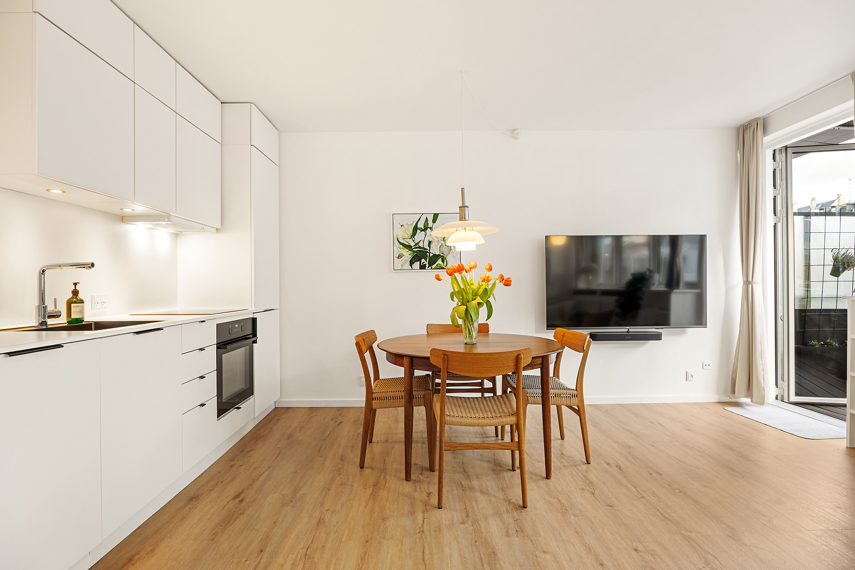 Entréen byder velkommen med god plads og rigelig skabsopbevaring. Herfra er der direkte adgang til denstore, lyse stue, hvor det stilfulde, nye køkken er elegant integreret i den ene ende af rummet og indeholder alle hårde hvidevarer inkl. opvaskemaskine. Stuen har plads til både sofaarrangement og spisebord, og de store nye vinduespartier i hele rummets bredde giver et flot lysindfald. Fra stuen er der udgang til en stor, sydøstvendt altan med plads til både møbler og planter.