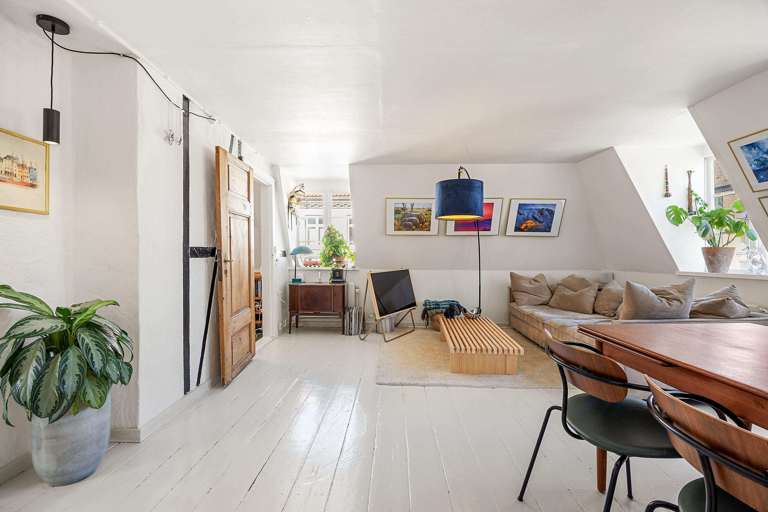 Tæt ved ligger Christianshavns Kanal, som giver et maritimt præg med husbåde, kaj-miljø og barer, caféer og restauranter. I den østlige ende af gaden ligger Wilders Plads med hyggelige gårdrum, kreative erhverv og kunstgalleri. Her får man hele to etager for sig selv i en lejlighed der byder velkommen med en stor entre hvor der er mulighed for opbevaring og her er trappen til den øverst etage også. Her finder man ligeledes indgangen til badeværelset der er flisebelagt med bruseniche og en skøn udsigt over Københavns tage.