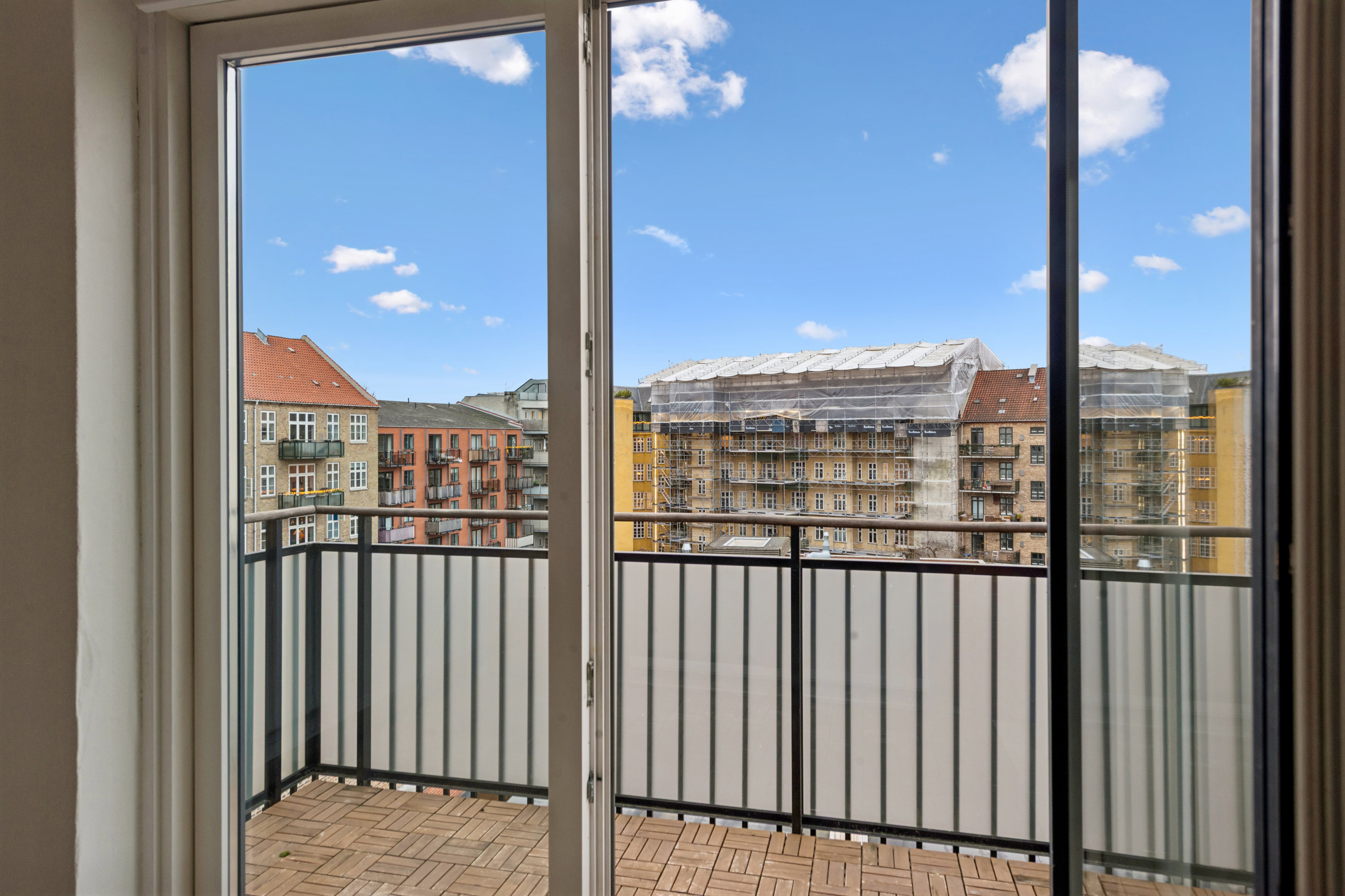Den store altan fungerer som lejlighedens udestue og inviterer til morgenkaffen i solen eller en stille aften med udsyn til de charmerende byhuse. Den åbne udsigt og det lette lysindfald trækker boligen ud i det fri og skaber en oplevelse af luft og lethed, der komplimenterer det urbane liv.