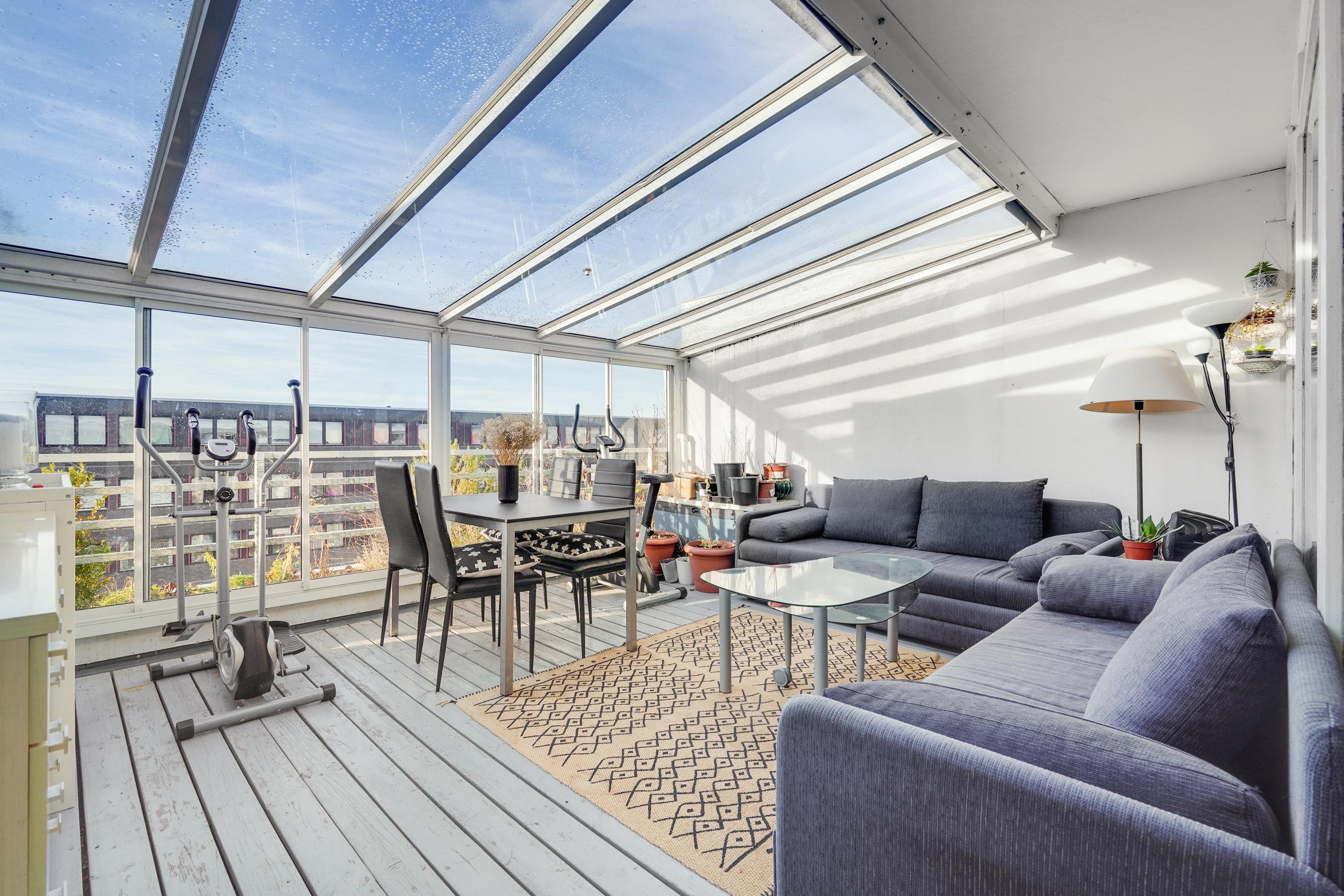 Du får samtidig et dejligt udsyn ud over områdets fællesarealer, og endelig er lejligheden også trukket godt tilbage i forhold til de øvrige længer i bebyggelsen, hvilket gør, at du er fri for direkte indkig fra genboerne.De mange fordele ved den høje placering får følgeskab af en særlig skøn detalje: Nemlig den direkte udgang til en tagterrasse, der er både overdækket og inddækket, og som derfor også kan agere udestue i de måneder, hvor det er for køligt at benytte den som terrasse. Den kan med andre ord inddrages i familiens daglige gænge året rundt.Kigger vi nærmere på selve planløsningen, er der udgang til terrassen fra en stor stue, der sammen med køkkenet udgør lejlighedens opholdsafsnit og naturlige omdrejningspunkt. Køkkenet er dobbeltsidet, og der er dermed godt med albuerum til hjemmets kok eller kokke. Og samtidig er der i enden af køkkenet etableret en fin, lys spiseplads, hvorfra der på samme måde som fra terrassen er et dejligt udsyn over nærmiljøet.I et separat afsnit byder boligen på et soveværelse og yderligere to gode børneværelser. Dertil kommer et brusebadeværelse og et gæstetoilet, og endelig er det også værd at fremhæve de gode kvadratmeter i entréen, som gør, at der her er plads til såvel overtøj som til, at ungerne kan bruge pladsen til at lege på.I bebyggelsen er der som nævnt flere fine fællesarealer.