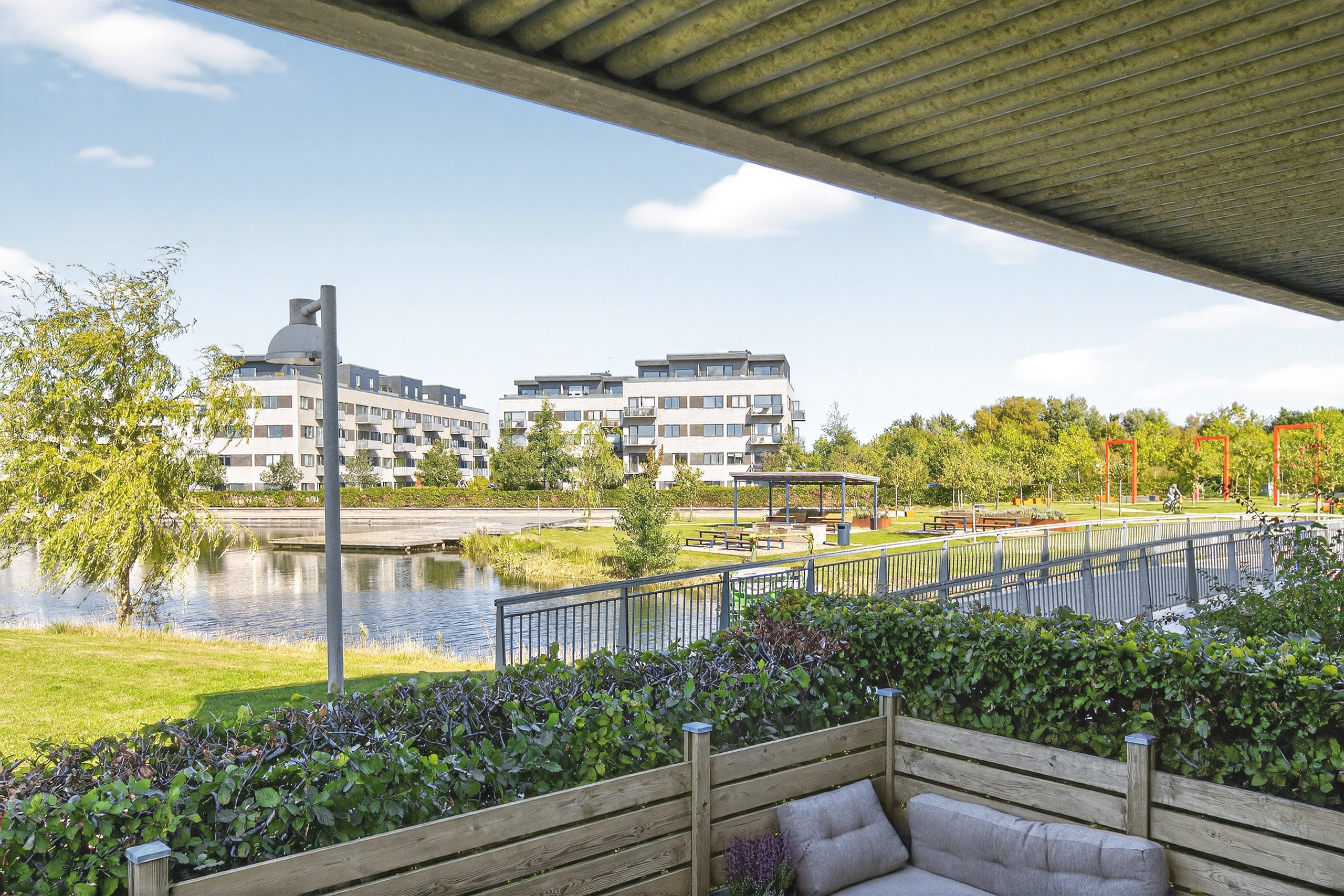 Beliggenheden er noget helt særligt. Området er præget af hyggelige stier, rolige omgivelser og grønne fællesarealer, der indbyder til afslappende gåture langs naturen og søen. Samtidig bor du tæt på indkøb, offentlig transport og andre daglige bekvemmeligheder.