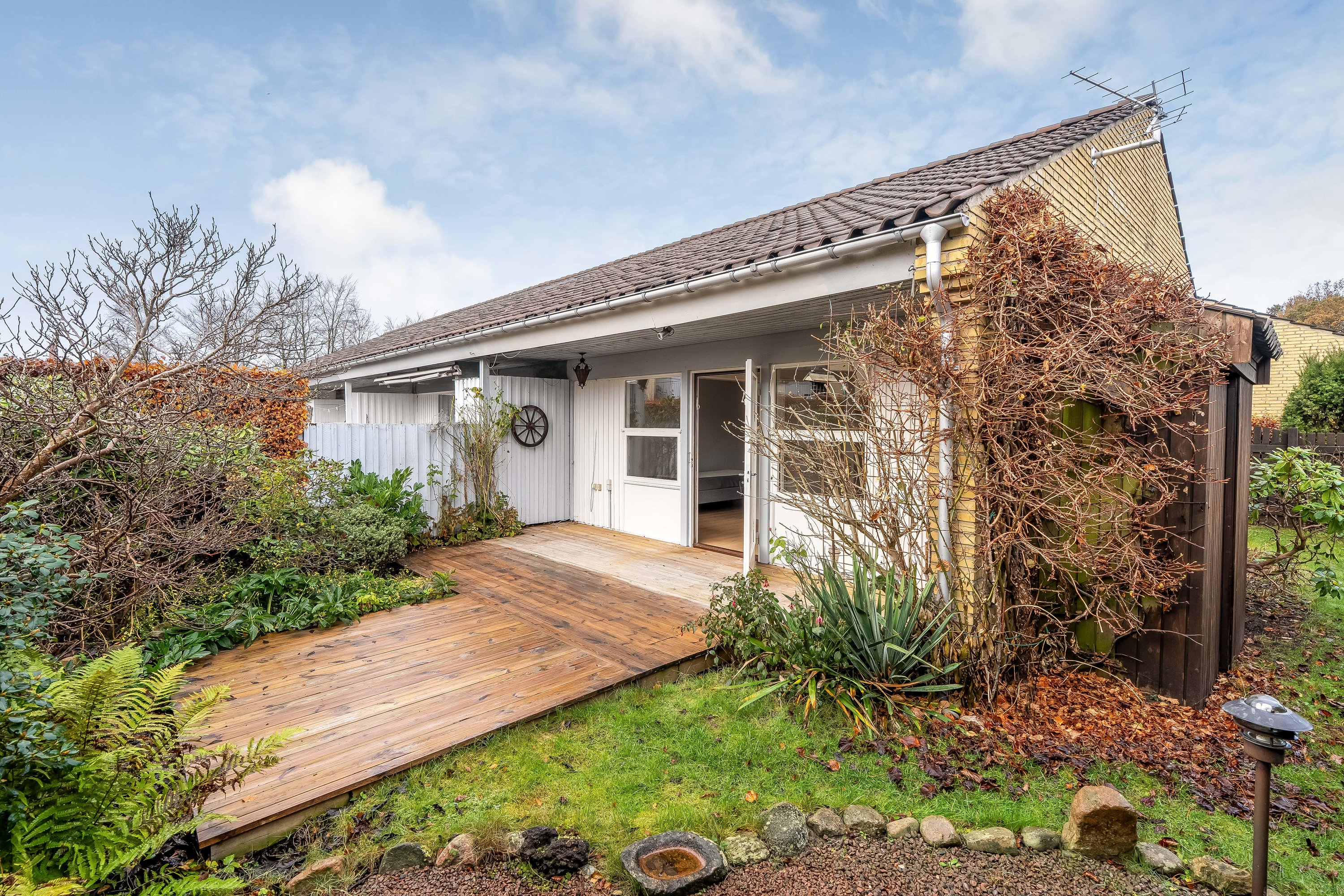Denne velplacerede rækkehus-lejlighed fra 1972 byder på en rolig atmosfære og en usædvanligt stor have, som tidligere ejer især har holdt af for sit smukke lys og sin åbne fornemmelse. Fra stuen er der direkte adgang til en træterrasse uden niveauforskel, hvor udelivet let kan blive en naturlig forlængelse af boligen – ideel til morgenkaffe, sommermiddage og afslapning i solen.