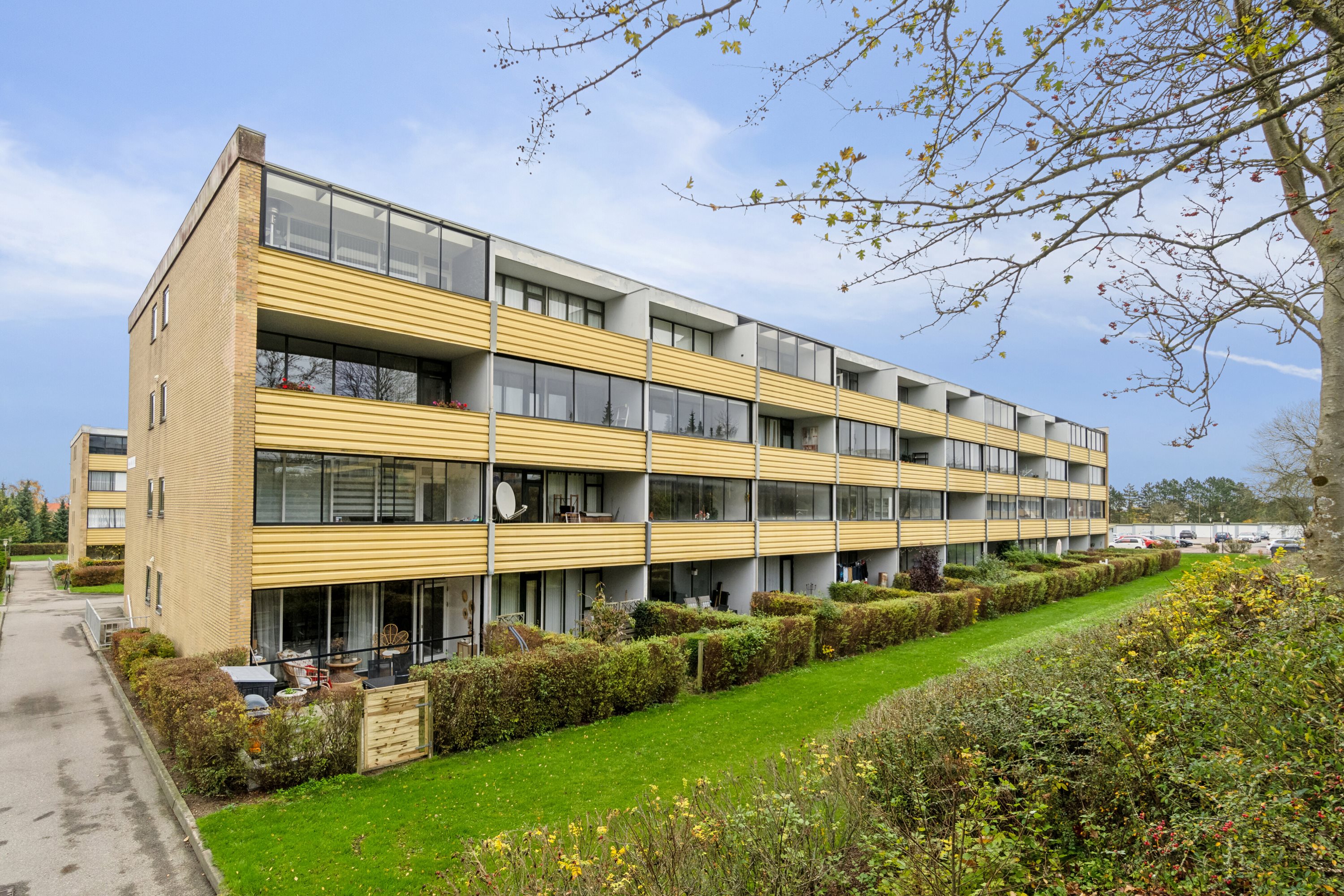 At lejligheden på Byskov Alle 30 er gennemgribende renoveret skinner tydeligt igennem. I overtager en helt indflytningsklar bolig, hvor to værelser, et badeværelse, et køkken-alrum og en stue står klar til at danne rammen om jeres hverdag. Prikken over i’et er den sydvendte altan, som er lukket.Der er altaner til begge sider og i hele lejlighedens bredde, hvilket giver en fantastisk fornemmelse af lys og luft. Stuens store vinduespartier vender mod syd, så lysindfaldet er helt særligt, og herfra er der forbindelse til den største altan, som forlænger opholdsmiljøet fra forår til efterår. Køkkenet er en flot, hvid sag med grebsfrie elementer, en integreret kogezone, en opvaskemaskine og plads til en kombineret vaskemaskine. Begge værelser er rummelige og regulære, mens badeværelset har et moderne touch i form af store, grå fliser og en separat bruseniche. I entréen er der både et integreret skab samt adgang til et mindre depotrum. Glæd jer til at indtage den sydvendte altan, hvor solen skinner det meste af dagen, ligesom glaspartierne skærmer for vind og vejr. Trænger I til jordforbindelse, trækker I ned på det grønne fællesareal. I får hverken langt til naturen eller hverdagens fornødenheder med denne adresse. Skoven nås efter et kvarters gang, så der er grønne omgivelser til løbeturene, og hvad angår indkøbsmuligheder, så er den nærmeste dagligvareforretning kun en kilometer væk. Er det bylivet, der lokker, cykler I til VestsjællandsCentret eller bymidten i løbet af et kvarter. Lyder det som noget for jer? Så kontakt os for en fremvisning eller for nærmere information allerede i dag.