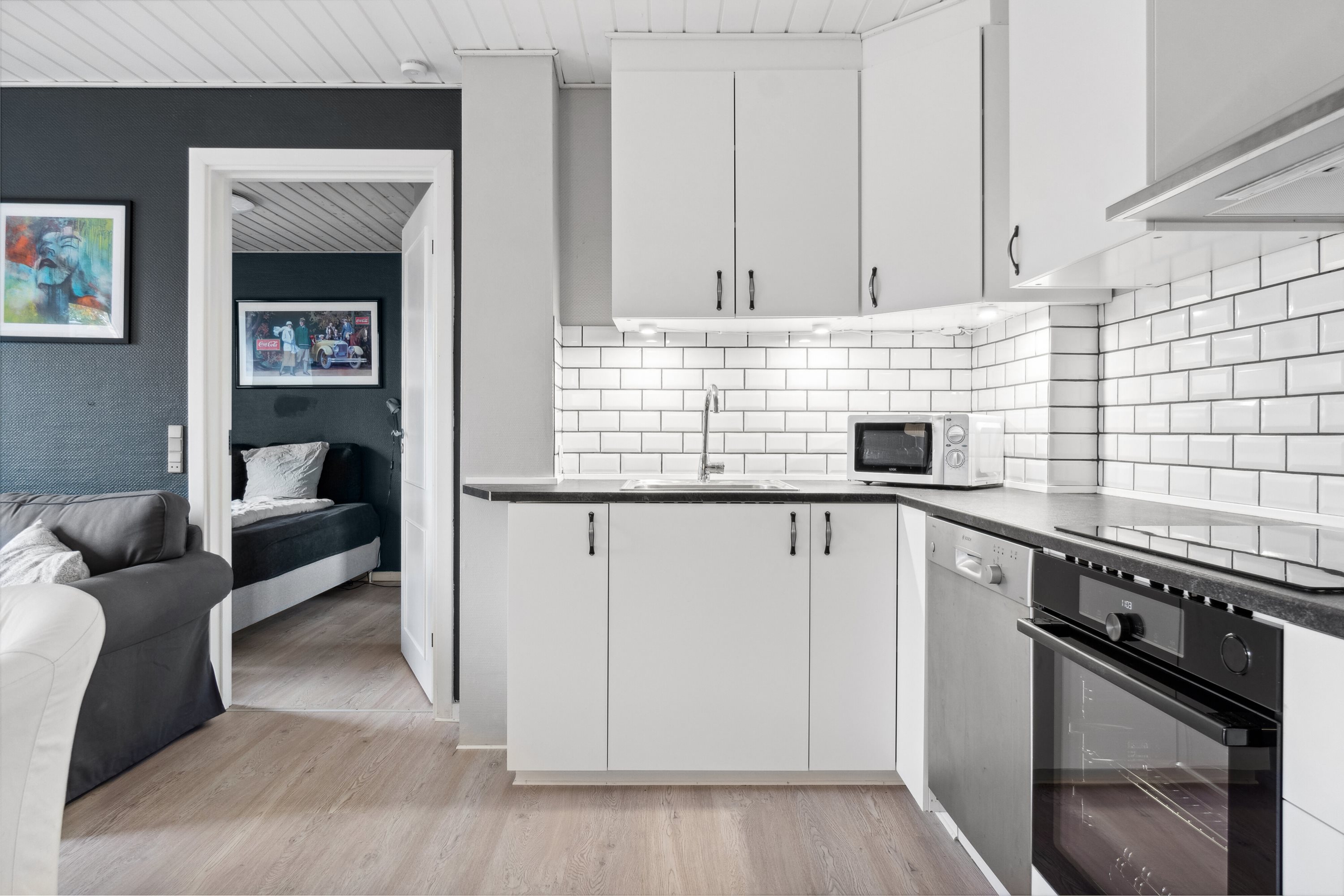 Udover opholdsrummet er der et rummeligt badeværelse med bruseniche og plads til en vaskemaskine samt et pænt soveværelse. Sidstnævnte har et indbygget garderobeskab og rummer desuden dobbeltsengen.