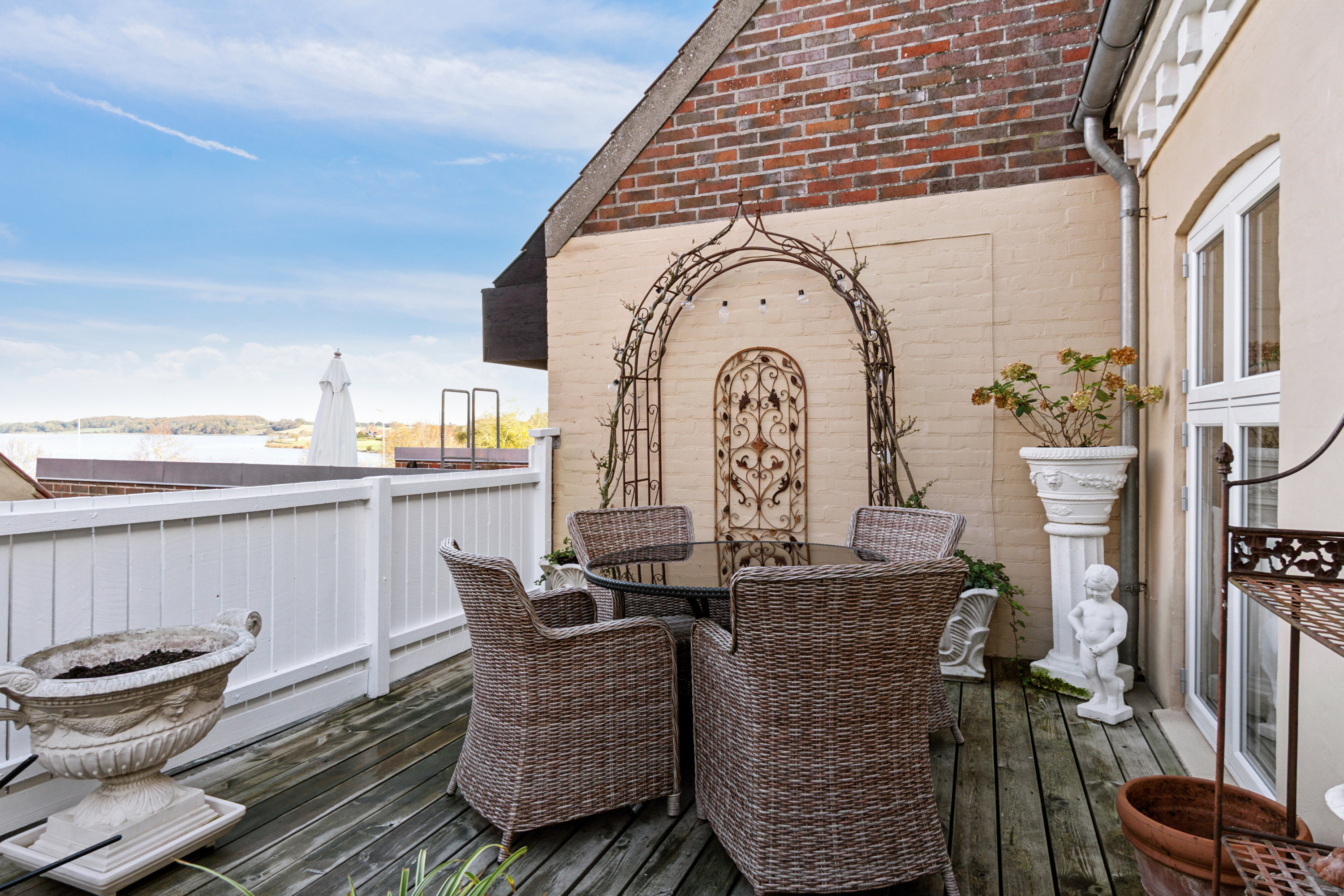 Selvom I bosætter jer i en lejlighed midt i byen, bliver I hverken snydt for plads eller udearealer. Til de mange kvadratmeter bolig hører nemlig en ugeneret, læfuld og solrig træterrasse på omtrent 30 kvm med udsigt over Noret, som bliver et markant trækplaster i sommerhalvåret.