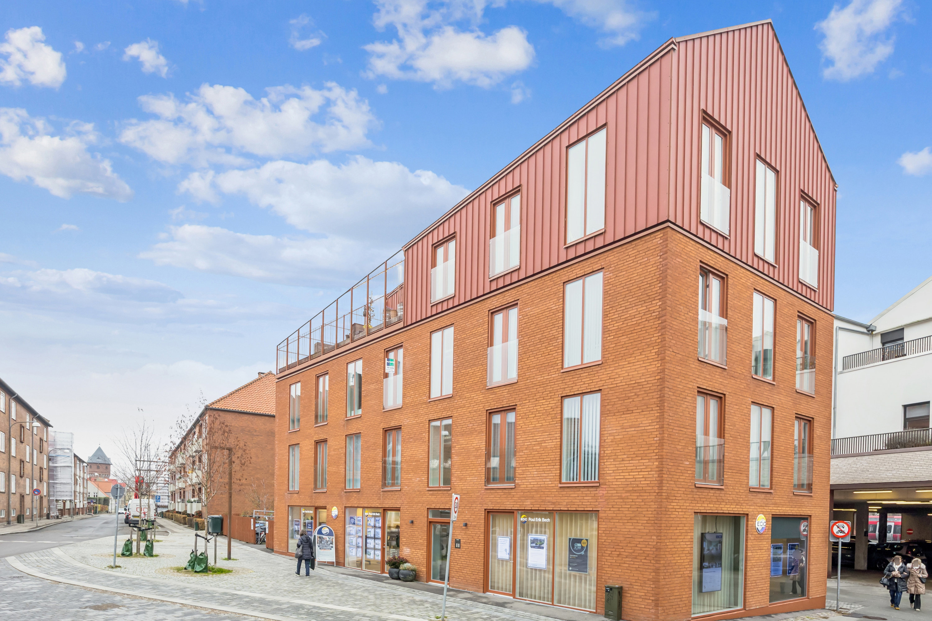 EJENDOM Ejendommen er opført i klassisk, rødt murværk og fremstår solid, velholdt og moderne. Byggeriet er fra 2021 og tilbyder en række kvaliteter, der gør hverdagen nem og komfortabel, herunder elevator direkte til boligens etage og en generelt høj standard i materialevalg og isolering. Hertil kommer en attraktiv, fælles tagterrasse, som giver beboerne et skønt uderum med luft og udsigt over byens tage. Der er desuden tinglyst ret til parkering mod betaling i p-huset i området, hvilket giver jer en praktisk og fleksibel parkeringsmulighed trods den centrale placering. Lejlighederne i ejendommen har ikke altaner, men i stedet får I fordel af veldisponerede fællesarealer og en placering, der gør adgang til både byrum og naturområder enkel og hurtig. Ejendommen henvender sig til både førstegangskøbere, singler og par, der ønsker et bekymringsfrit hjem i moderne kvalitet uden behov for renovering.