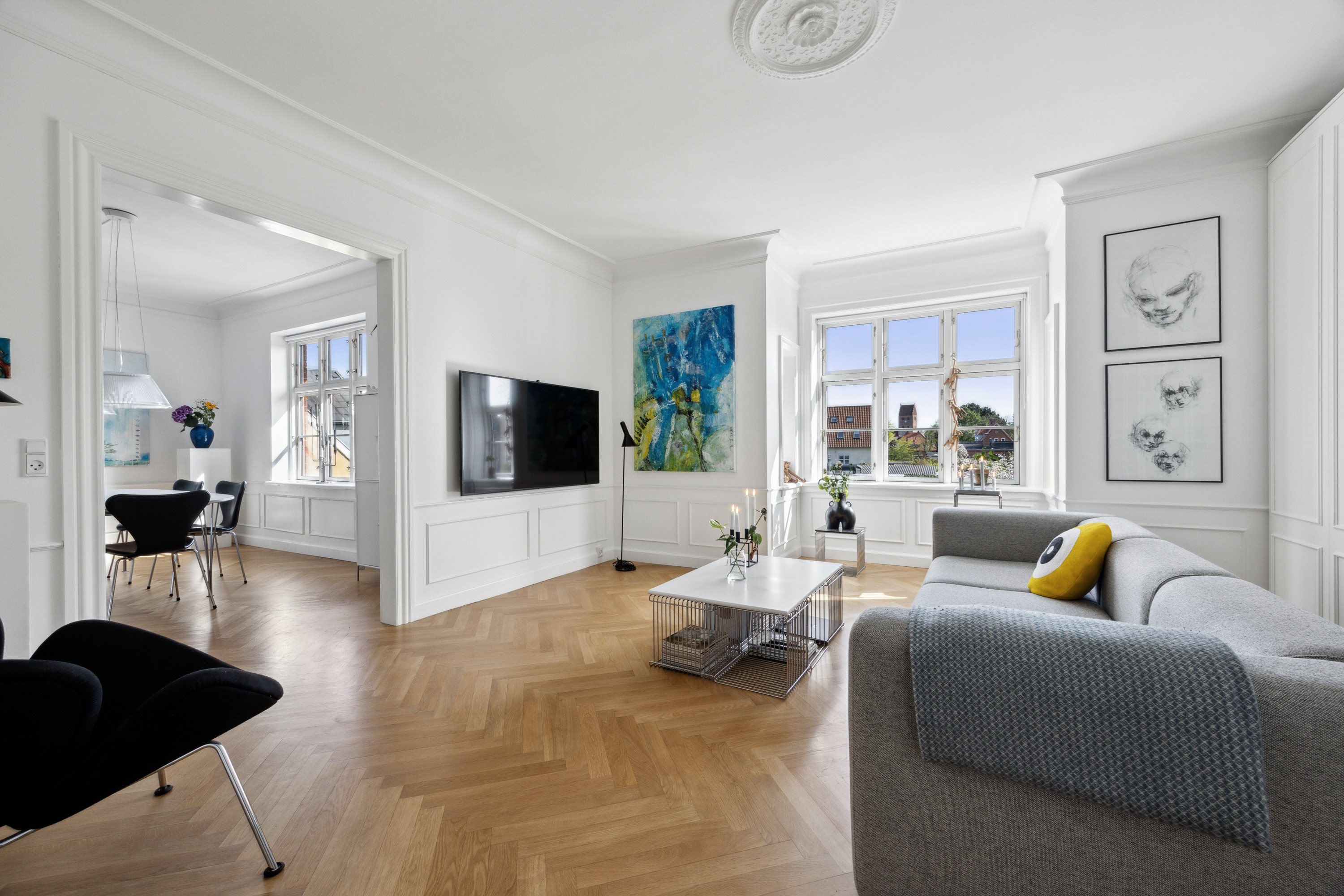 INDRETNING Lejligheden byder på en gennemtænkt og funktionel planløsning med en lys og indbydende atmosfære fra det øjeblik, du træder ind. De store vinduespartier lukker dagslyset ind og fremhæver de smukke originale detaljer som stuk, høje paneler og de generøse lofthøjder. Stuen fungerer som et naturligt samlingspunkt og er oplagt til både afslapning og selskabelighed. Det åbne køkken/alrum er moderne indrettet med kvalitetsmaterialer og god skabsplads – her er det nemt at invitere gæster eller bare nyde hverdagen i rolige omgivelser. Derudover byder lejligheden på tre gode værelser og et stilfuldt badeværelse.