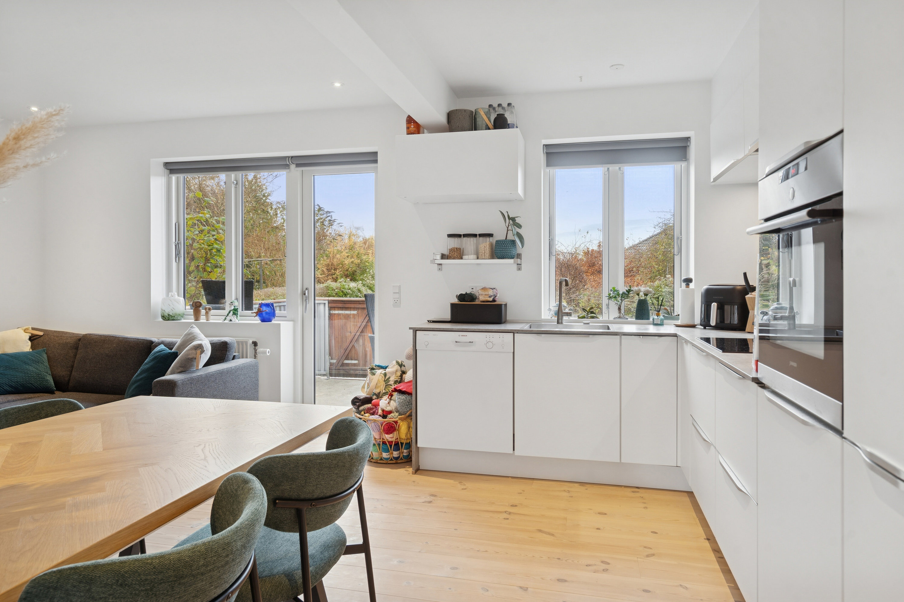 Her er der plads til både spiseområde og opholdszone, og rummet fungerer som boligens naturlige samlingspunkt for både hverdag og gæster.