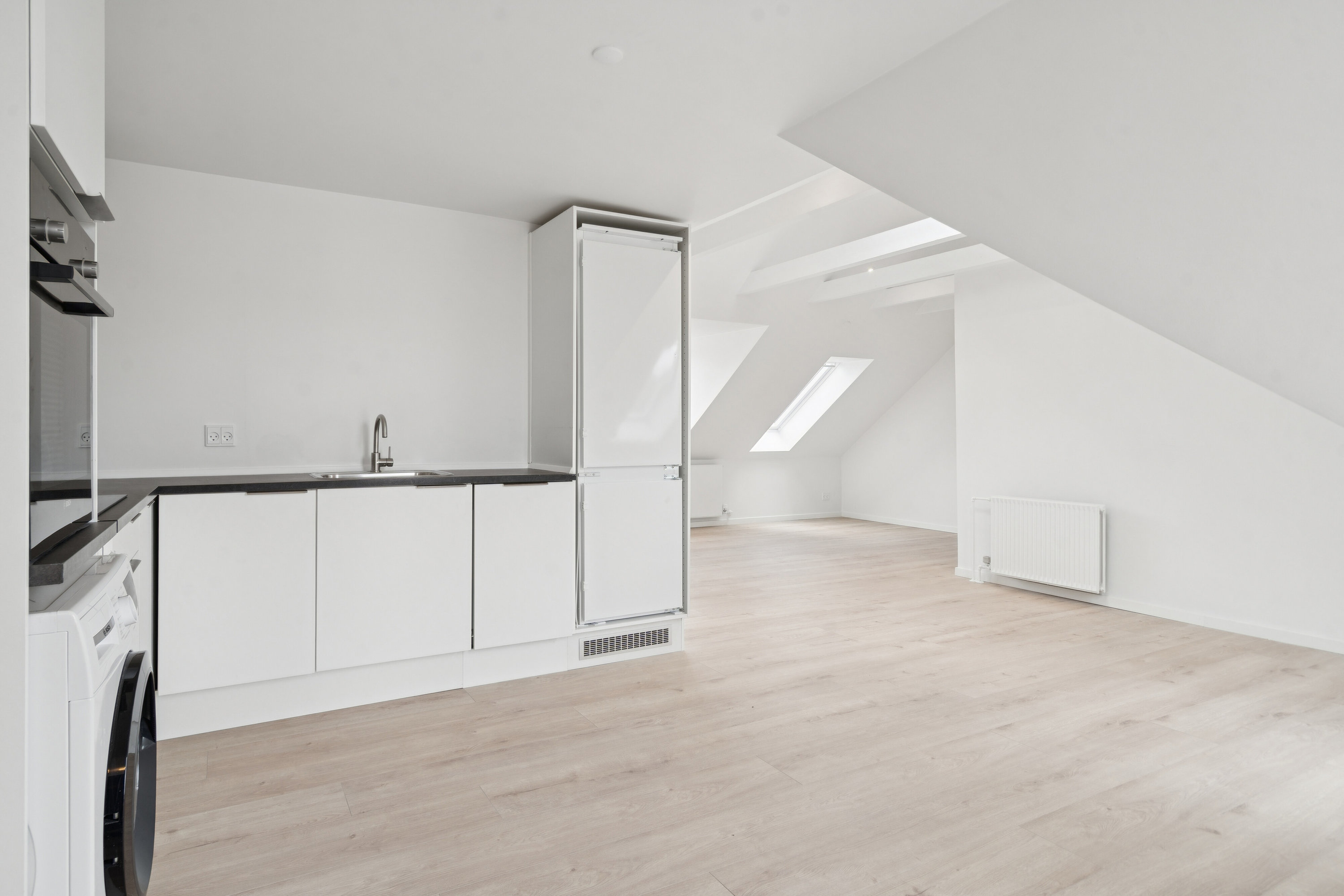 Lejligheden byder dig velkommen i en rummelig entré med god opbevaringsplads. Herfra træder du direkte ind i det åbne opholdsrum, hvor stue, spiseplads og køkken smelter sammen i ét – en lys og luftig løsning, der skaber en dejlig fornemmelse af plads.