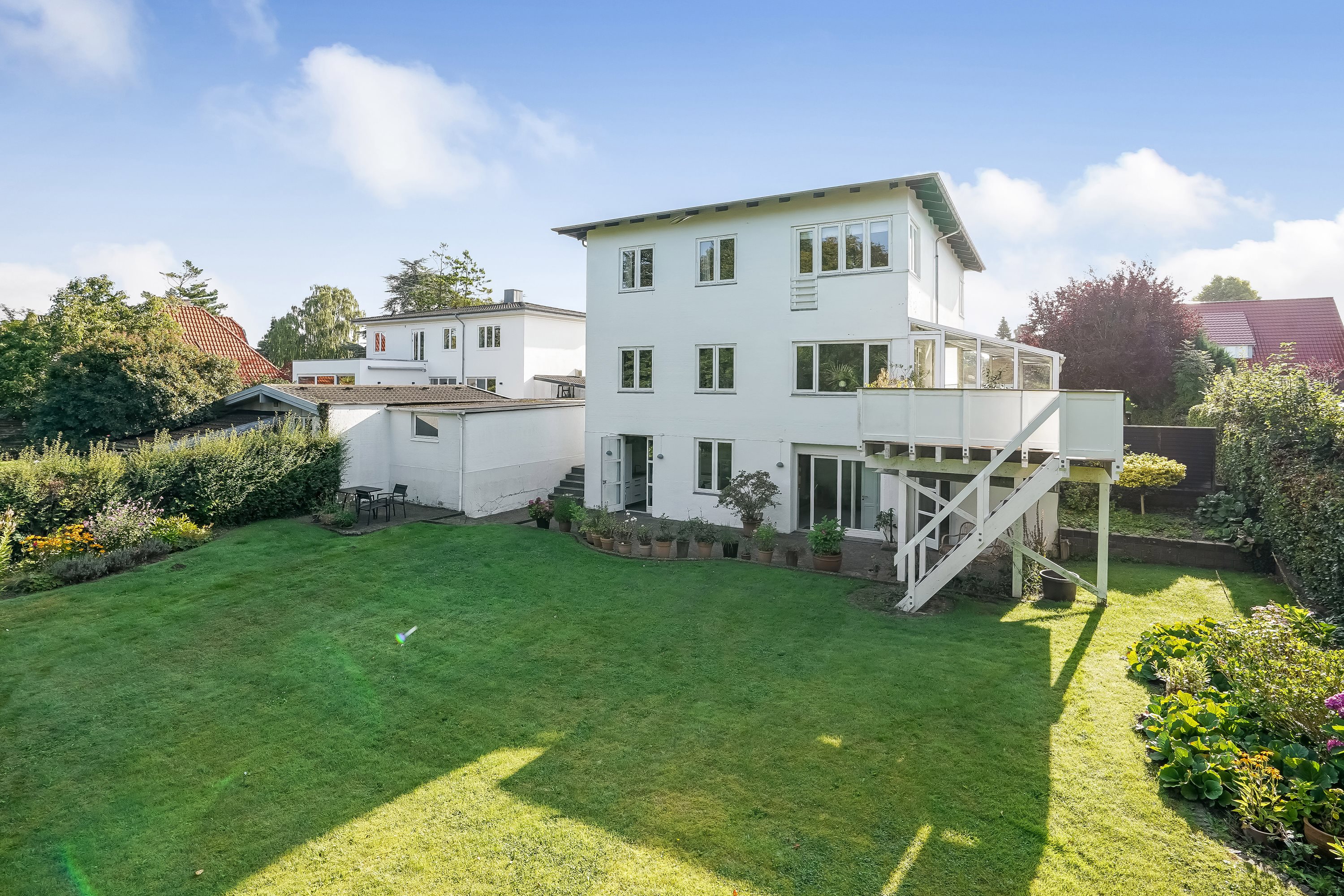 Høj kælder lejlighed ned terræn til fantastisk sydvestvendt terrasse og have.