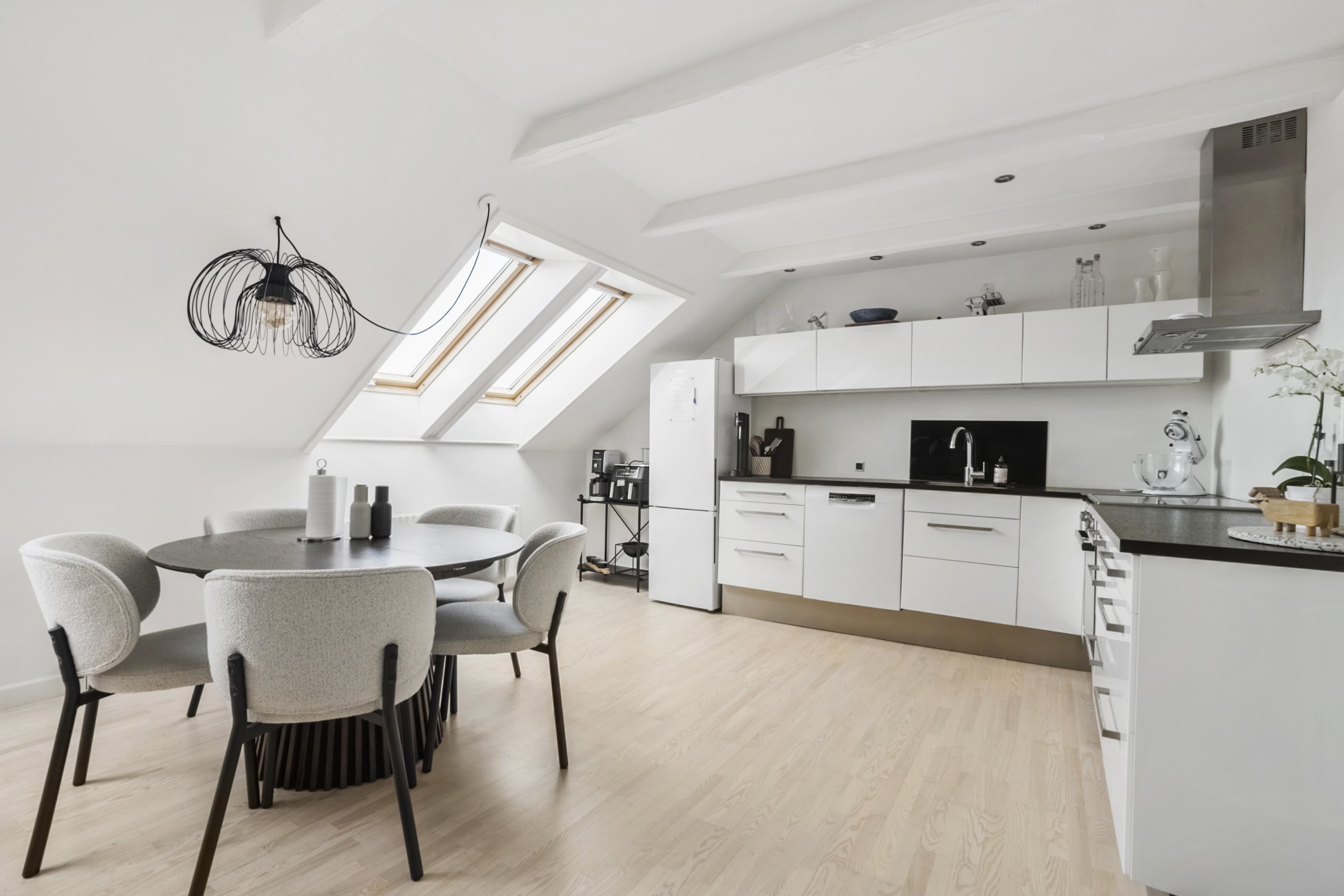 Boligens indretning er gennemtænkt med stuen, spisestuen og køkkenet er samlet i ét stort åbent rum, hvilket giver rig mulighed for at indrette med både spiseplads og opholdsområde, hvor dagslys strømmer ind gennem vinduer og ovenlysvinduer.