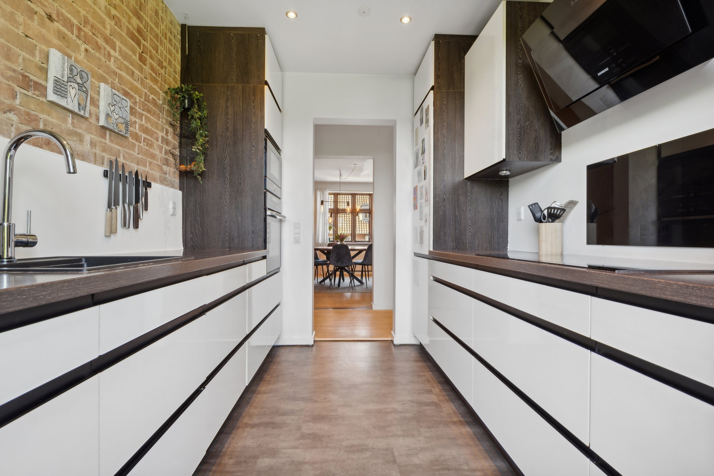 Køkkenet er fra Svanekøkken og står fuldt tidssvarende i strømlinet design med hvide elementer og integrerede hvidevarer fra Siemens. Ligesom i stuen er der også her en væg med råt murværk, og så er der tilmed udgang til en lille altan med morgensol. Også badeværelset står flot og har blandt andet el-gulvvarme og en stor bruseniche. Lejligheden afrundes af soveværelset, der er dejligt rummeligt med god plads til både seng og garderobeskab.