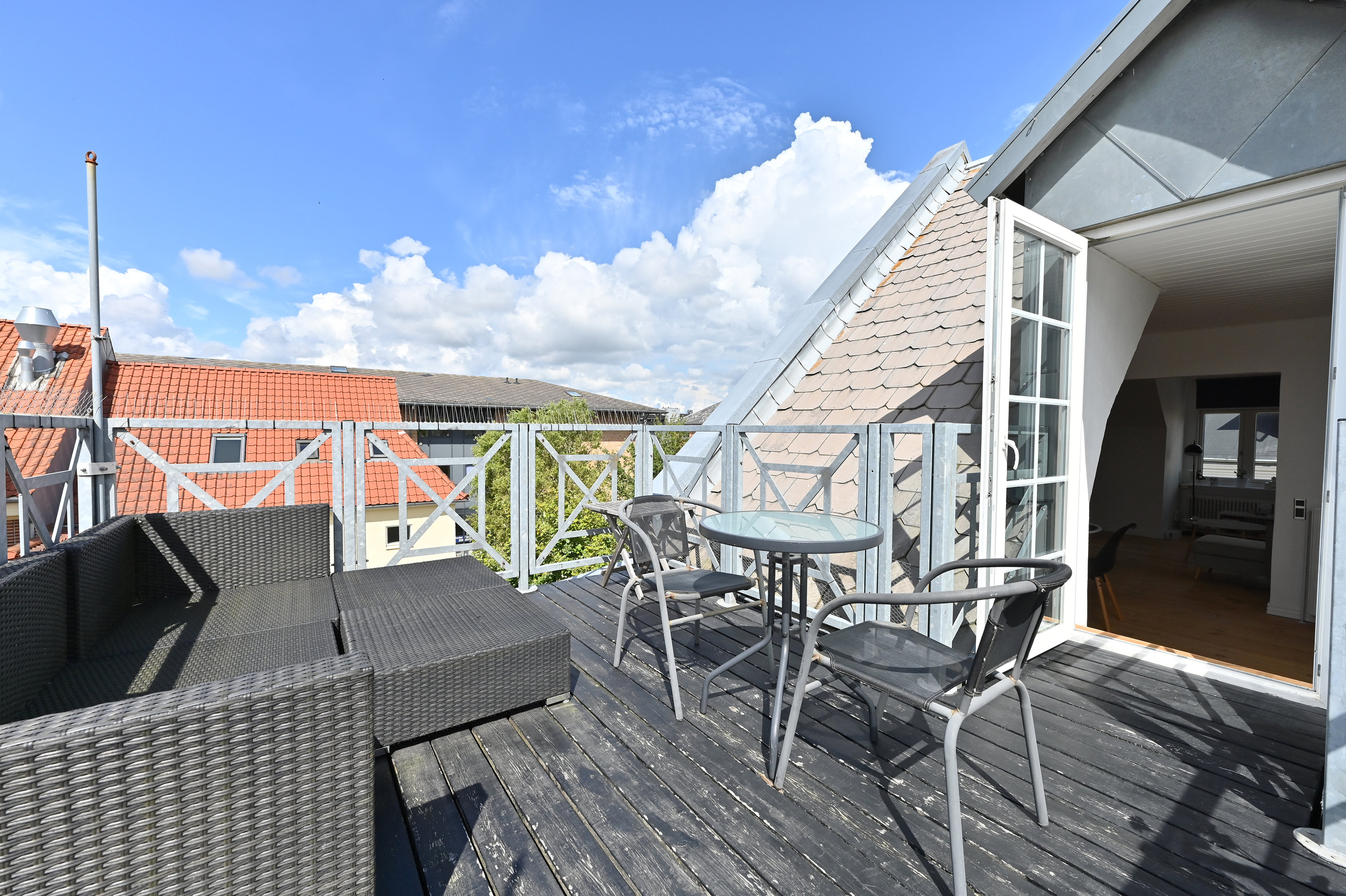 Tagterrassen er et ekstra lækkert plus, og et ekstra rum udenfor. Orienteringen er stik syd, og sol og luft kan nydes det meste af dagen. Pladsen på terrassen, er god og udover den fine udsigt over Herning, er der mulighed for masser af hygge med venner og familie i både loungemøbler, med grill og med kolde drikkevarer.