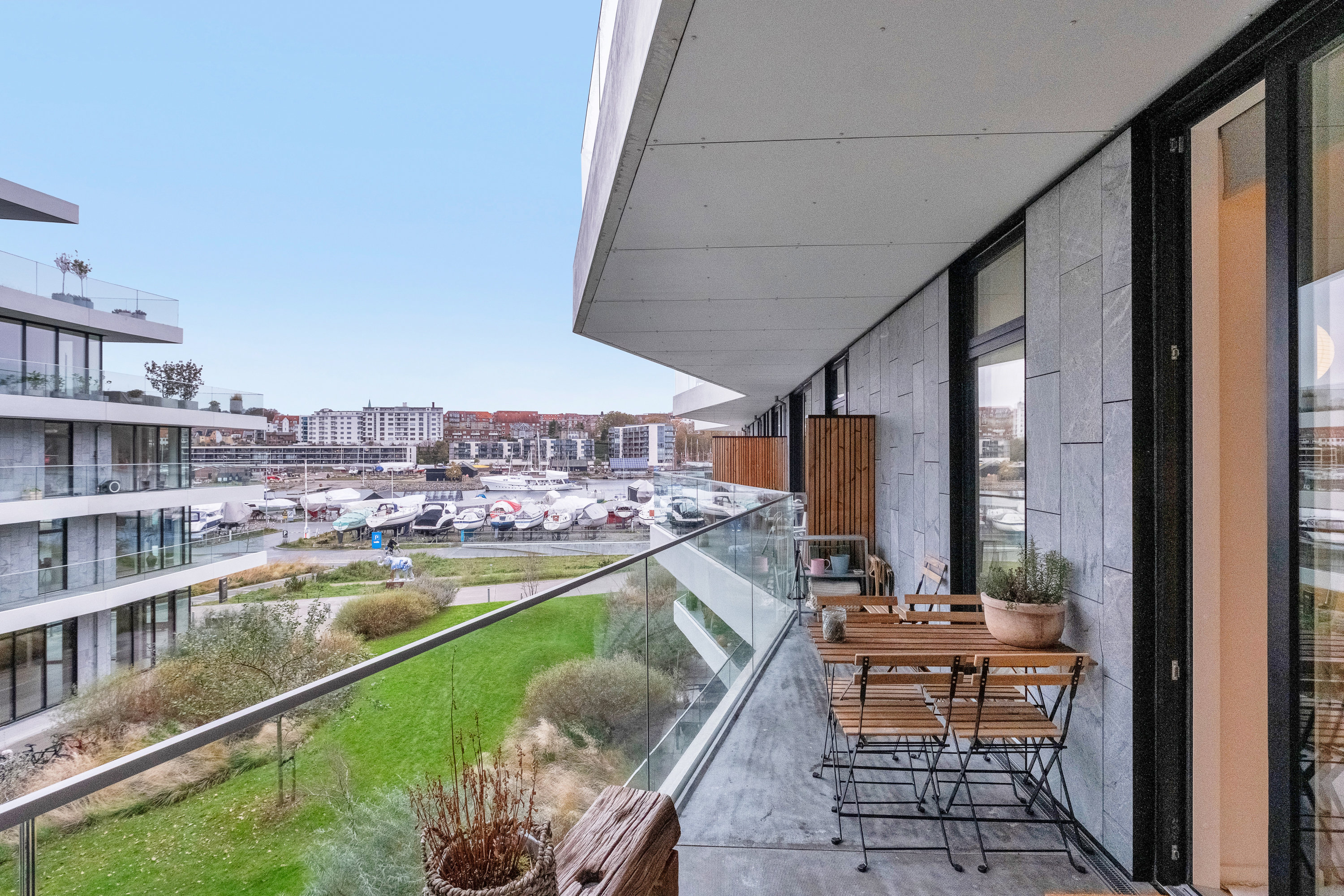 På de to gode altaner, kan du sidde i læ og nyde solen og den friske havluft på alle tider af dagen. Samtidig kan man følge skovens farveskift som årstiderne skifter og se indsejlingen til havnen. En eminent velindrettet ejerlejlighed i høj kvalitet.
