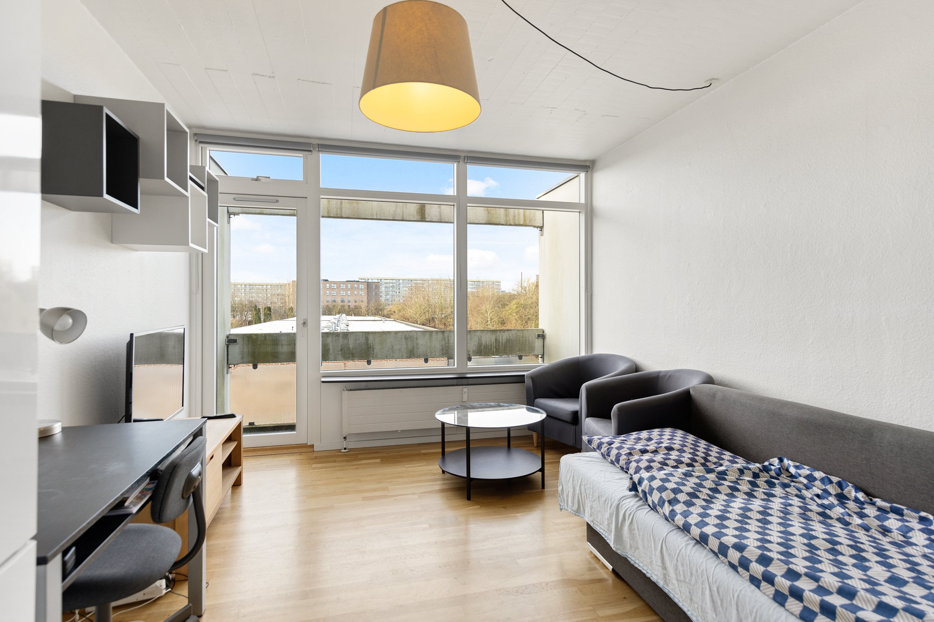 Fra opgangen træder du ind i entréen, der også fungerer som køkken for at få den maksimale udnyttelse af pladsen. Her er der hvide elementer og et trinettekøkken, så madlavningen snildt klares i det daglige. Fortsætter du videre ind i boligen, når du stuen med et pragtfuldt lysindfald fra det brede vinduesparti og altandøren, hvor du nemt kan indrette dig med et bord og en seng. Endeligt er der et brusebadeværelse med stilrene grå fliser på væggene og hvide elementer.