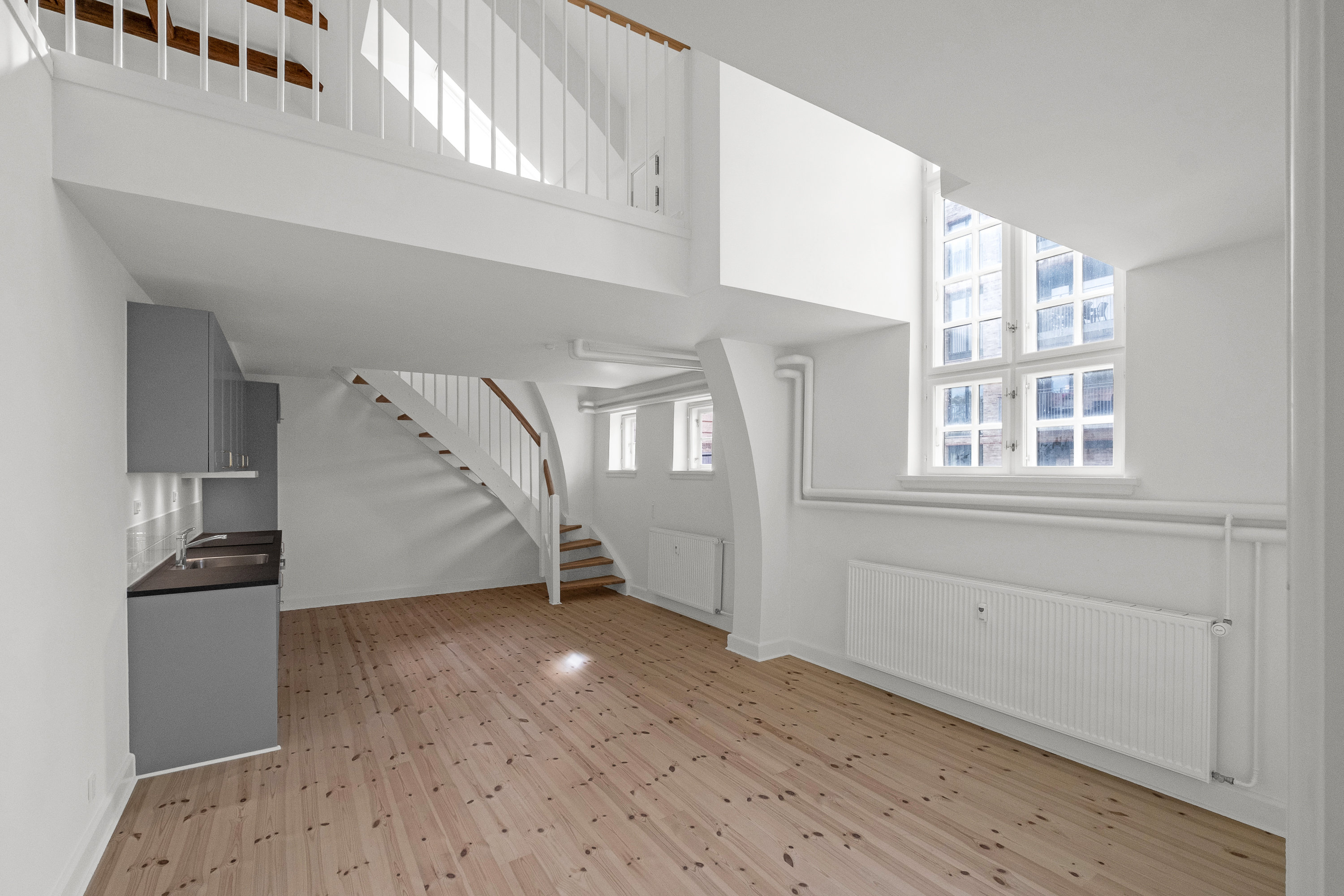 Boligerne er nænsomt renoveret med respekt for historien og rummer en gennemført materialekvalitet, der understøtter de smukke rammer. Her finder du massive fyrtræsgulve, der bidrager til et varmt og naturligt udtryk, samt moderne Svane-køkkener i en blød og indbydende farvetone, som skaber hygge og en hjemlig atmosfære. De oprindelige sprossede vinduer er bevaret og restaureret med forsatsvinduer, som både fremhæver ejendommens arkitektoniske arv og sikrer et behageligt indeklima.