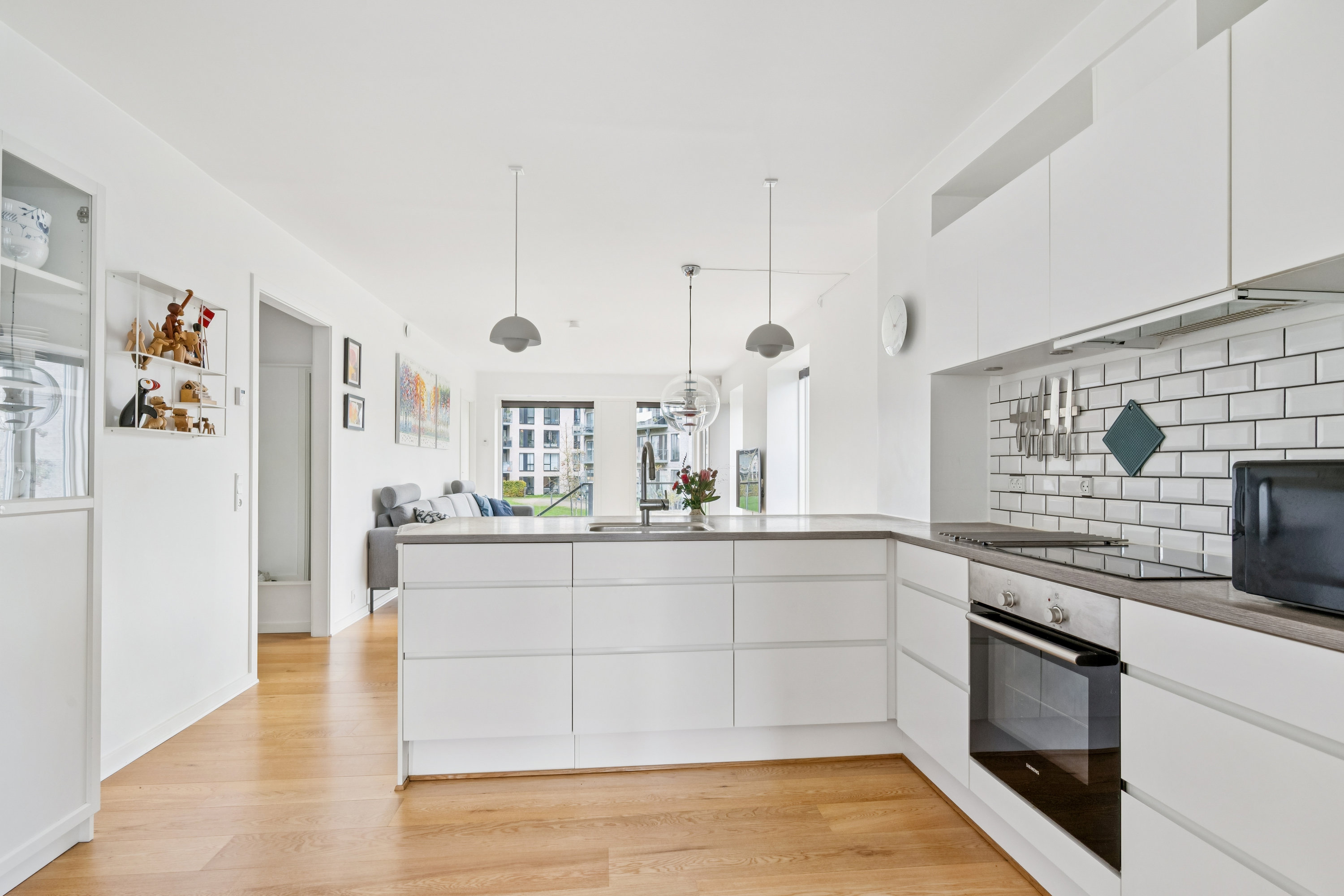 Når du træder ind, mødes du af en rummelig entré med god plads til overtøj og sko. Herfra åbner boligen sig mod det store, åbne opholdsrum, hvor stue og køkken flyder naturligt sammen. Det tidløse køkken fremstår stilrent med lyse fronter og god arbejdsplads, og rummet indbyder til både madlavning og samvær. Opholdsrummet har store vinduespartier, der sikrer et flot lysindfald og giver en rolig forbindelse til omgivelserne udenfor.