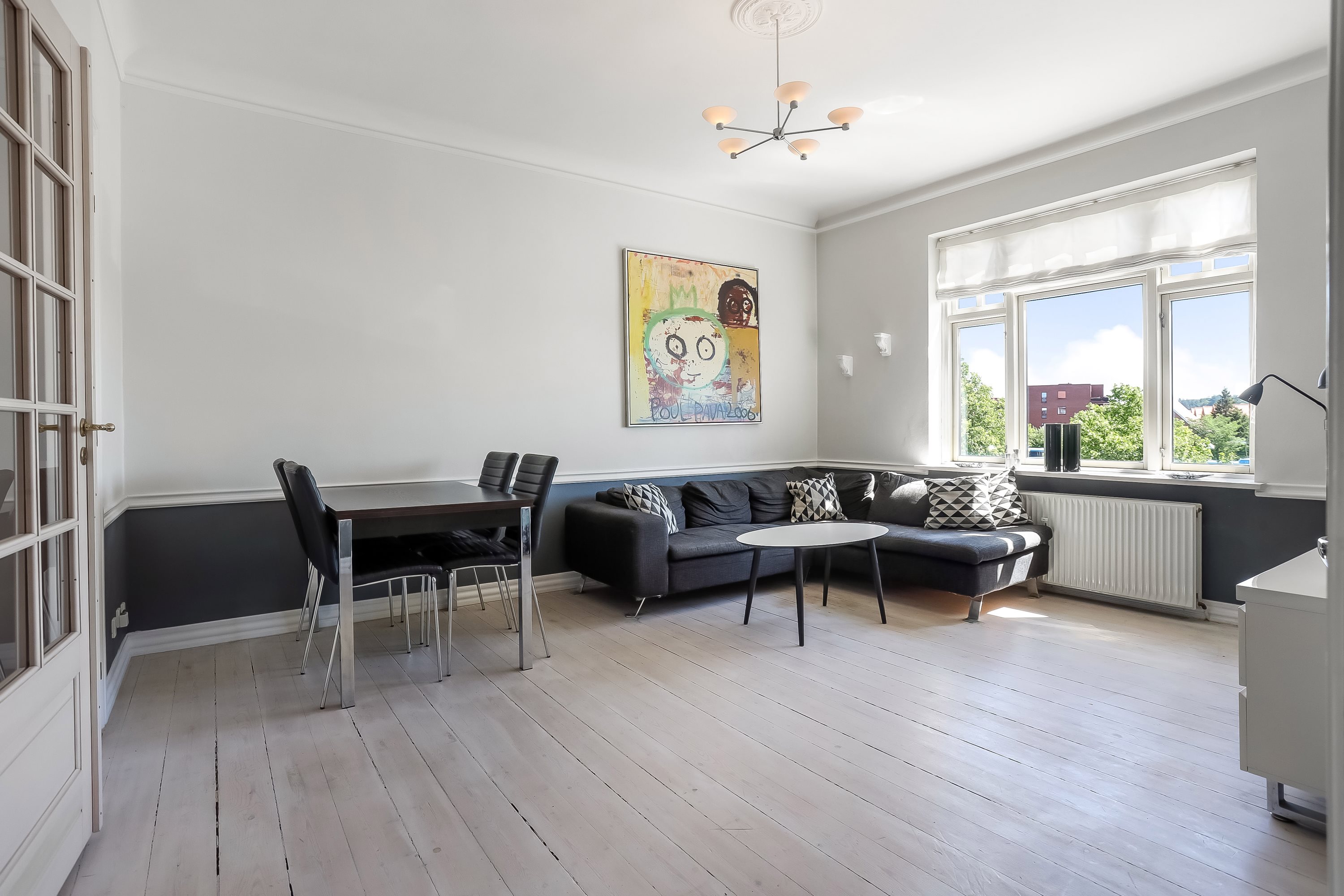 Lejligheden er på 69 kvadratmeter, som fordeler sig på en entré, to store stuer en suite, et badeværelse samt et køkken. Lejligheden gemmer på flere charmerende detaljer som eksempelvis den smukke stuk og rosette, buegang og de lyse plankegulve og har masser af muligheder.