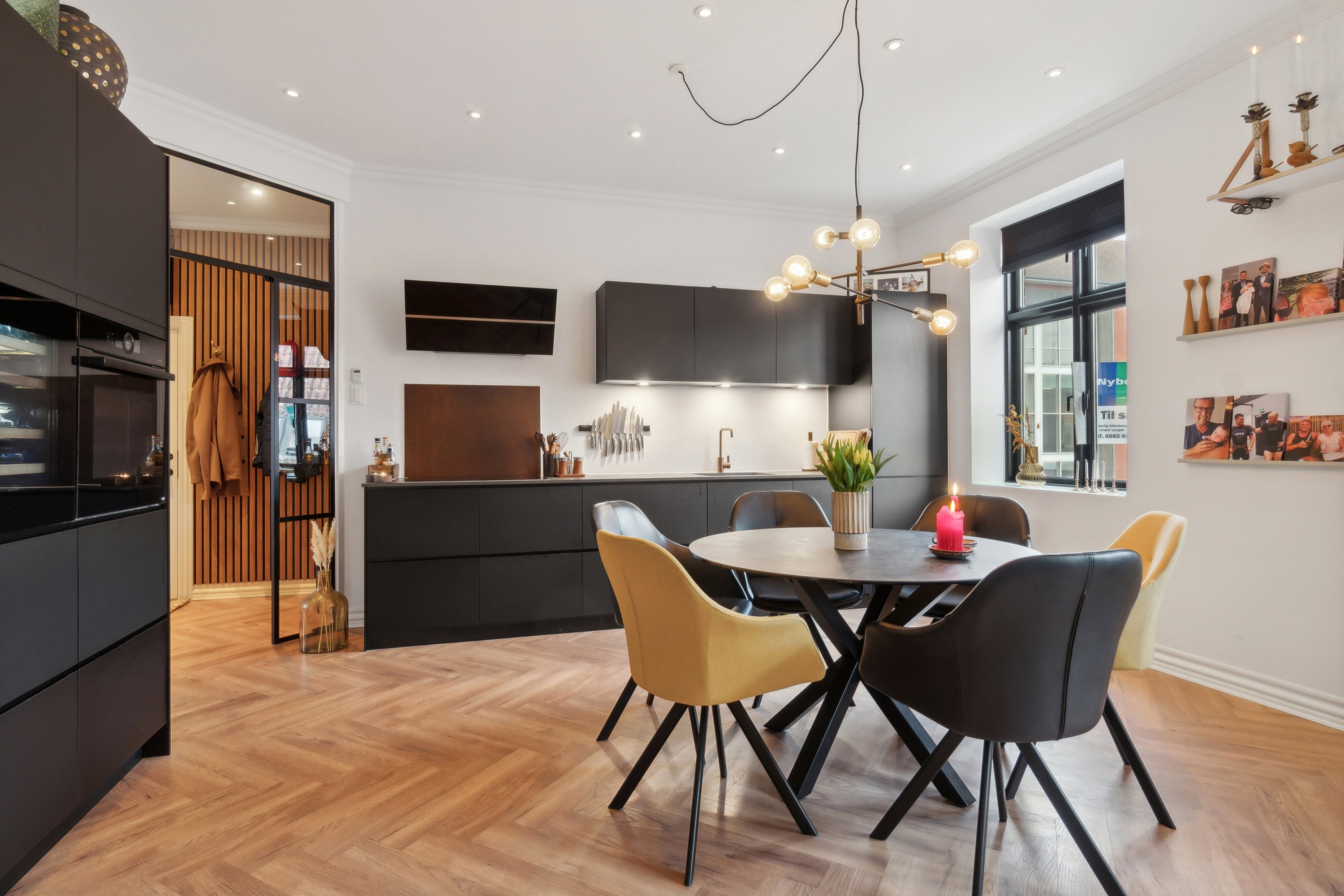 Fra entréen har I et skønt lysindfald gennem det New Yorker-inspirerede glasparti mod køkken-alrummet, og allerede her starter det flotte sildebensgulv, der går igennem hele lejligheden.