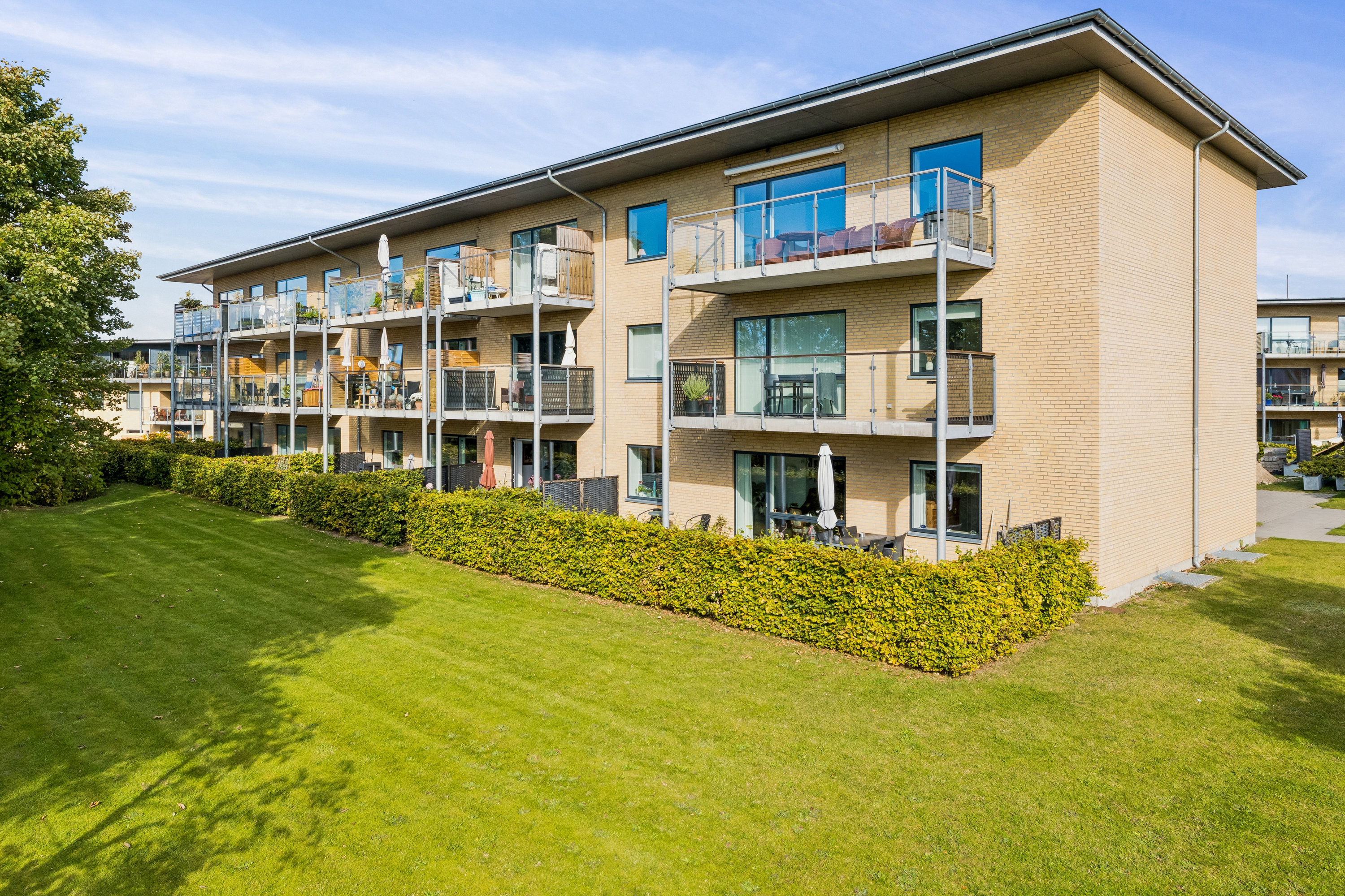 Lejligheden har to store altaner, begge med glasværn, så I kan sætte jer ud og nyde udsigten over trætoppe og åbent landskab i horisonten. Den ene altan er direkte tilknyttet stuen, hvilket gør det enkelt at tage morgenkaffen med ud, mens den anden fungerer som et roligt frirum.