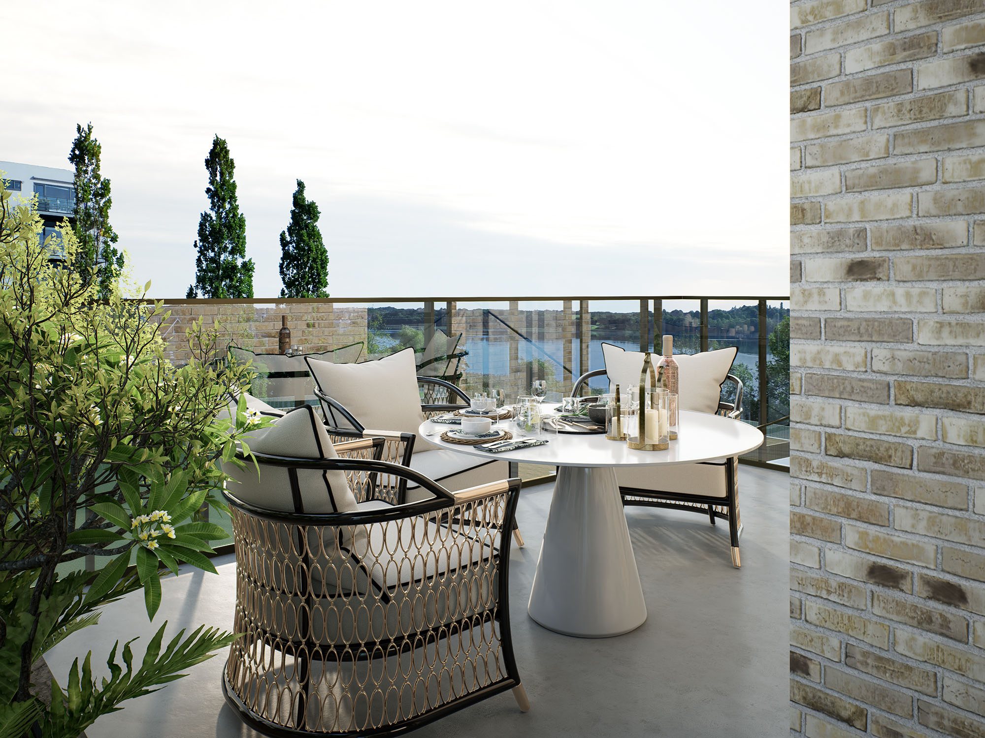 UDSIGT OVER BYEN, DOMKIRKEN ELLER SØEN Udsigten er et gennemgående element for alle 73 boliger, og selv på 1. sal er du højt placeret. De store altaner fungerer som en naturlig forlængelse af boligerne med overdækket overgang mellem ude og inde, samtidig med at de skyder sig ud fra bygningen som horisontale platforme. Her kan du tage udsigten ind, eller invitere gæster til middag med udsigt på de lange, lune sommeraftener.