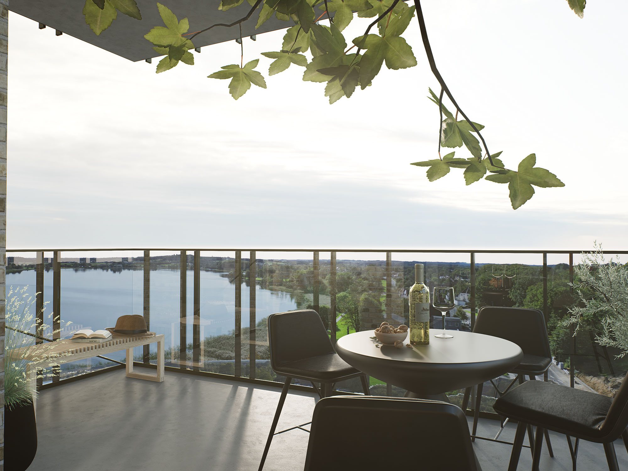 UDSIGT OVER BYEN, DOMKIRKEN ELLER SØEN Udsigten er et gennemgående element for alle 61 boliger, og selv på 1. sal er du højt placeret. De store altaner fungerer som en naturlig forlængelse af boligerne med overdækket overgang mellem ude og inde, samtidig med at de skyder sig ud fra bygningen som horisontale platforme. Her kan du tage udsigten ind, eller invitere gæster til middag med udsigt på de lange, lune sommeraftener.