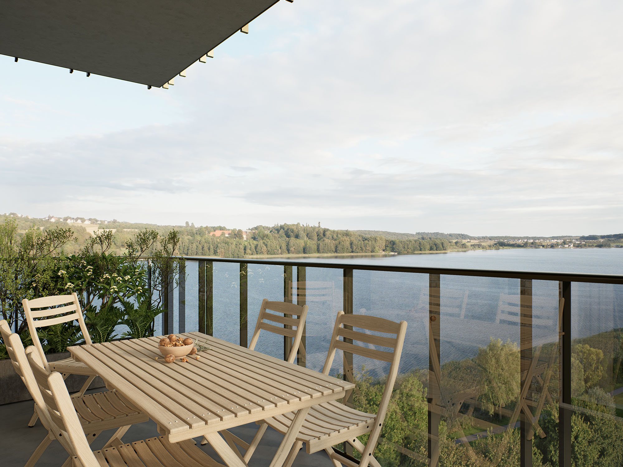 UDSIGT OVER BYEN, DOMKIRKEN ELLER SØEN Udsigten er et gennemgående element for alle 61 boliger, og selv på 1. sal er du højt placeret. De store altaner fungerer som en naturlig forlængelse af boligerne med overdækket overgang mellem ude og inde, samtidig med at de skyder sig ud fra bygningen som horisontale platforme. Her kan du tage udsigten ind, eller invitere gæster til middag med udsigt på de lange, lune sommeraftener.