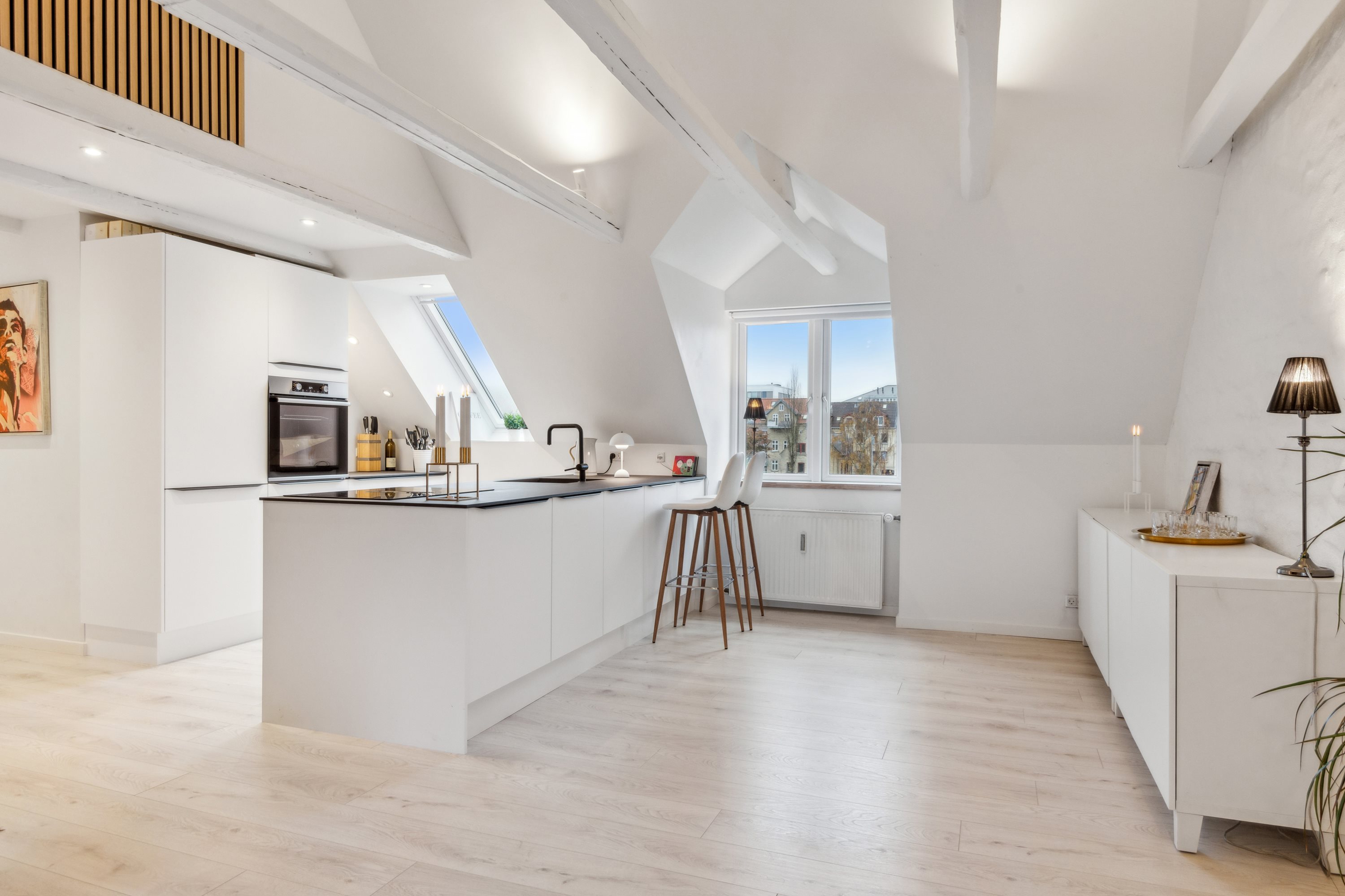 Tænk sig at få netop dét på en så central adresse, og tilmed øverst i ejendommen, hvor loftet strækker sig til kip i opholdsrummet. Lige her forenes stue og alrum i et åbent opholdsrum. I finder også to gode værelser, og, som de flotte omgivelser afslører, har sælger renoveret lige for nyligt. Akustikpaneler pryder indretningen, og det samme gør charmerende, fritlagte bjælker, der kan opleves på flere af de i alt 91 kvm. Det hele fuldendes af et stort badeværelse samt en hems, der kan forvandles til gæsteværelse, bruges til opbevaring m.m.
