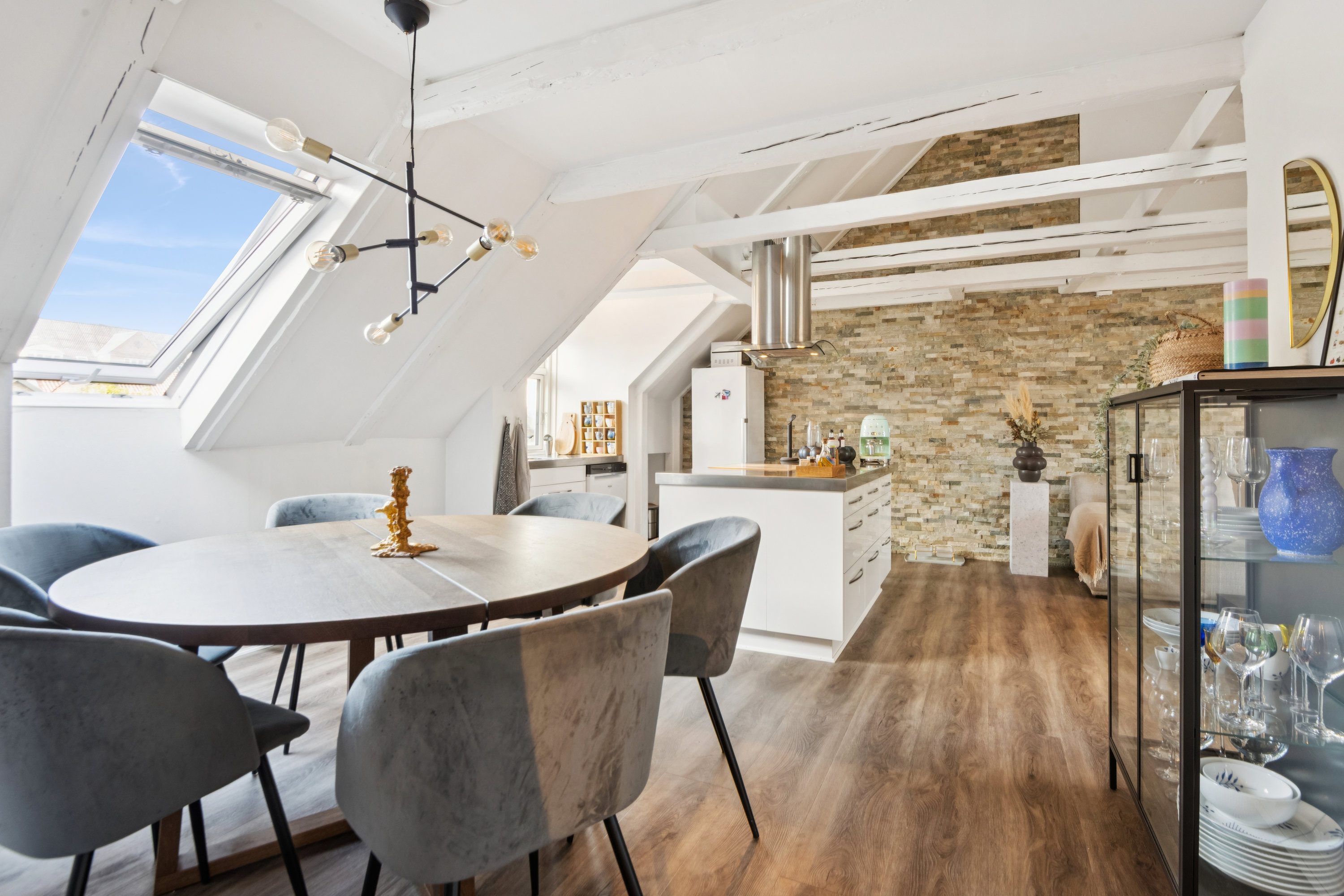 I træder ind til masser af naturligt lys, charmerende, blotlagte bjælker og loft til kip. Køkken, alrum og stue smelter over i hinanden i et stort, åbent og indbydende rum, og mens I via trapperne når den anvendelsesrige hems – måske til kontorplads eller ekstra værelse – ligger det gode soveværelse forneden. Det pæne, moderne køkken giver plads til madlavningen, og samtalen vil let flyde fra køkkenbord til spisebord og videre hen i sofaen. Sidste stop er det nydelige badeværelse med separat bruseniche. Hvad siger I til en fremvisning?