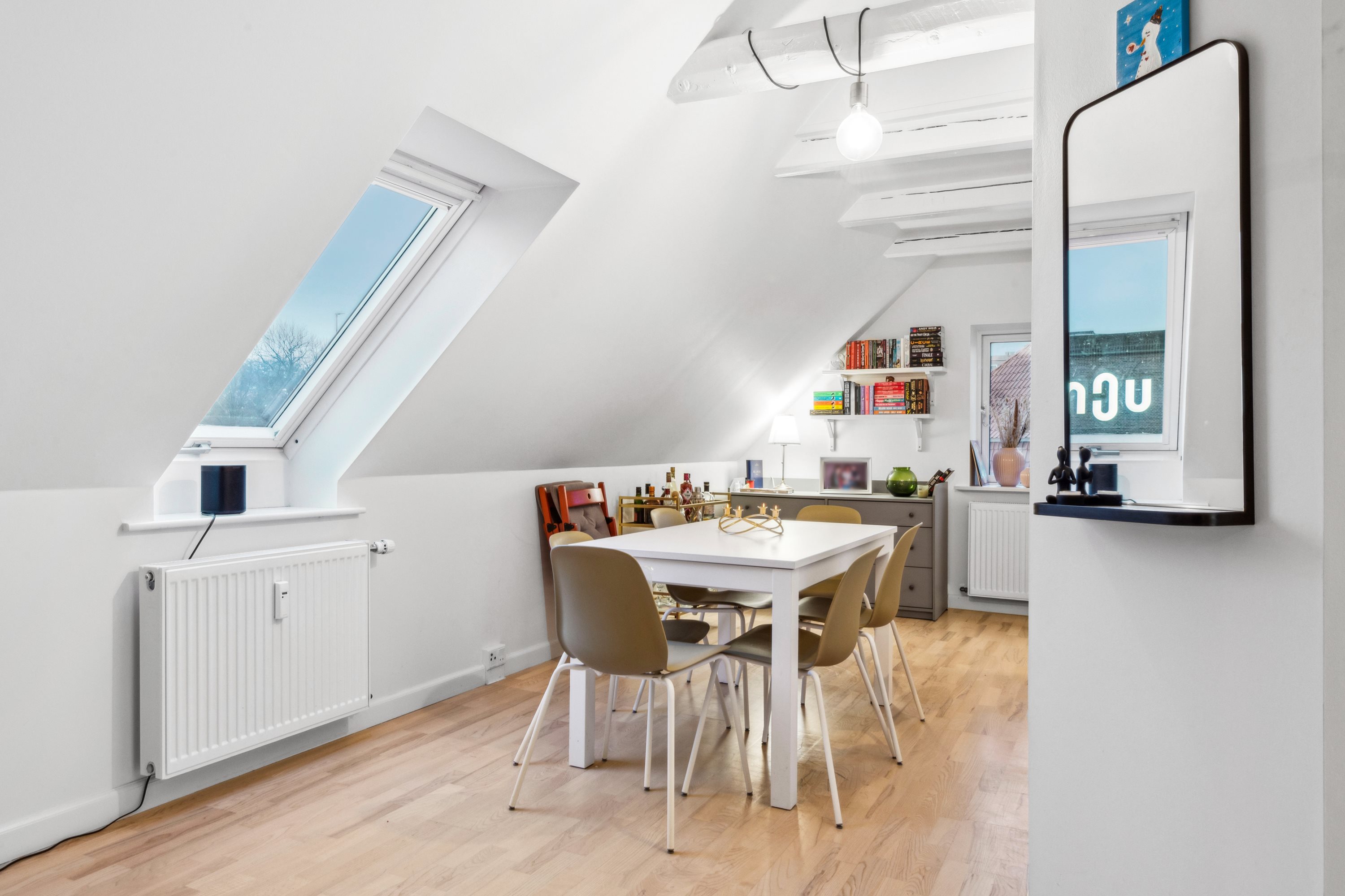 Følg med op på 2. sal, øverst oppe i ejendommen, hvor lyset og udsigten er allerbedst, og hvor skråvæggene indrammer den hyggelige atmosfære. I overtager 73 m2 fordelt på lejlighedens stueetage, men turen slutter ikke der, for på lejlighedens 1. sal venter jer nogle gode bonuskvadratmeter med en hems og et disp. rum fuld af anvendelsesmuligheder. Nedenunder finder I to værelser, et køkken, en stue og et brusebadeværelse. Det pæne, lyse køkken er i rigtig fin stand, og det samme gælder badeværelset. Og bemærk lige de charmerende, blotlagte bjælker, der løber langs lofterne!