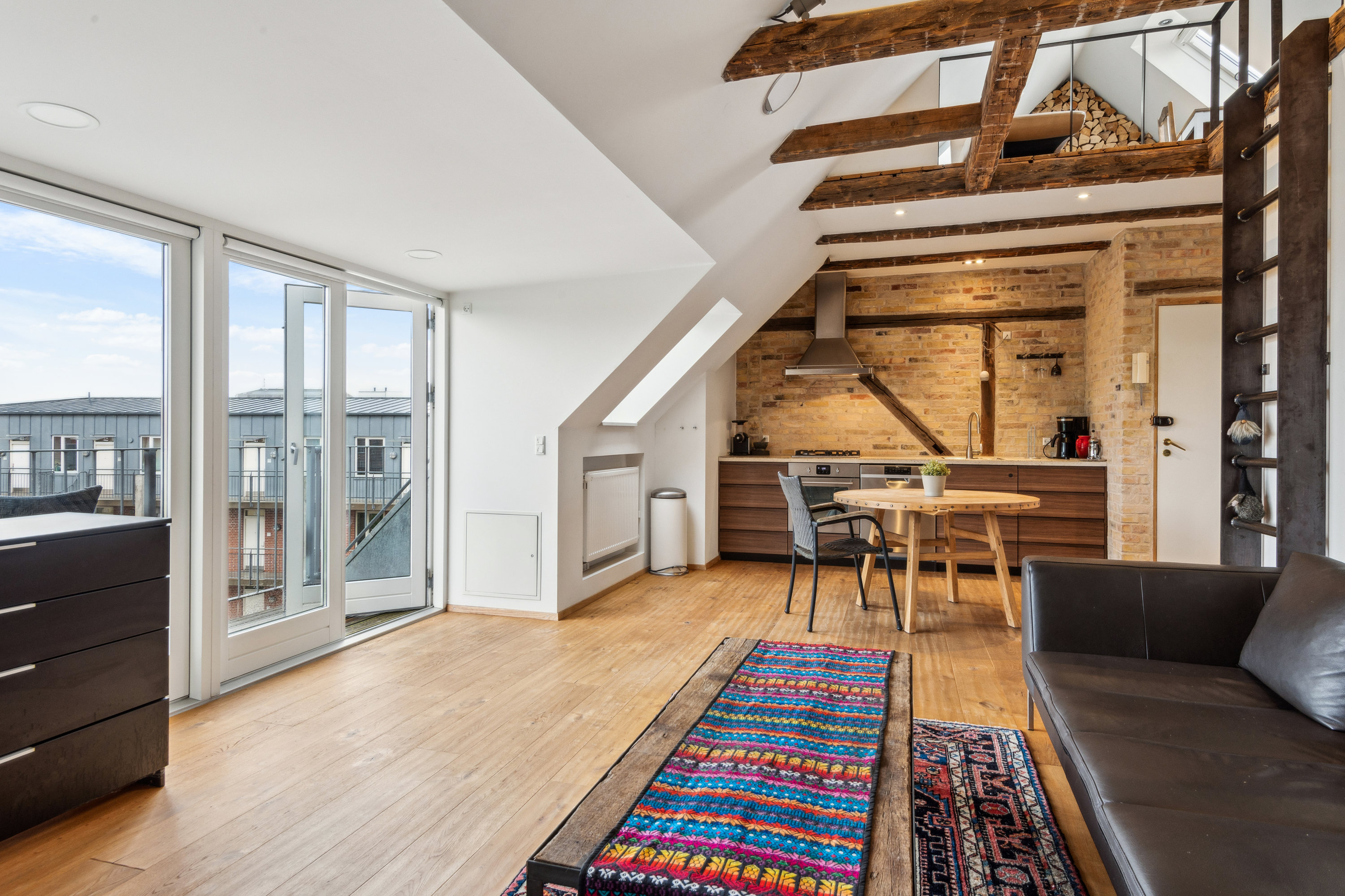 Loftet strækker sig til kip, og lige der, hvor stuen flyder direkte over i det flotte køkken, møder charmerende detaljer som blottede bjælker rå murstensvægge, mens den klassiske New Yorker-væg fortsætter hele vejen op og skaber en opdeling mellem opholdsrummet og værelset. Et godt lysindfald præger boligen – ikke mindst oppe på den brugbare hems, der kan benyttes som et ekstra værelse eller kontor, og den store finale er det meget rummelige badeværelse, hvor vaske- og tørrefaciliteterne er elegant gemt væk.