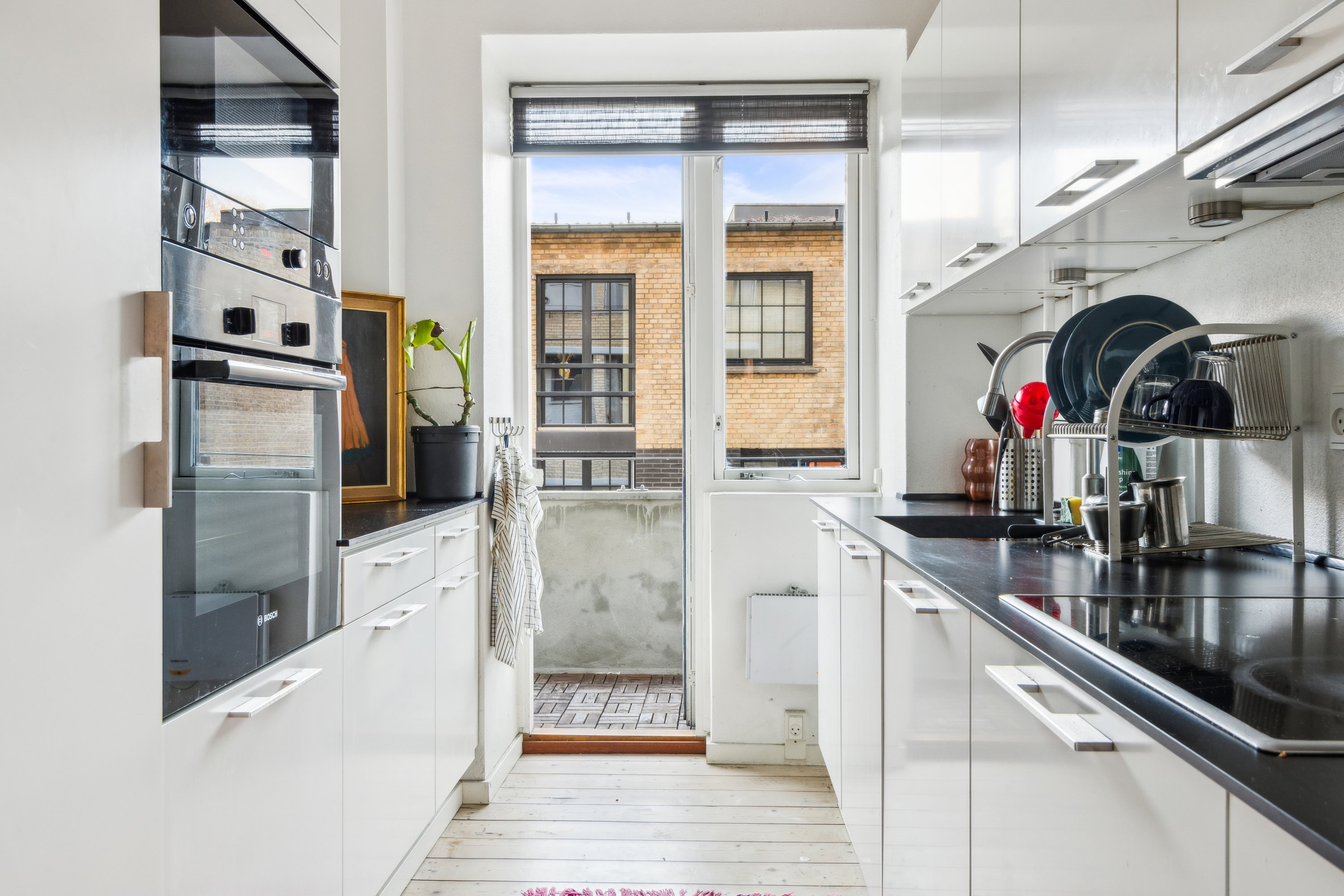 Den fine ejendom har stået her på den ikoniske gade siden 1939, og siden da er den blevet flot vedligeholdt, så alt fungerer, som det skal. Lejligheden placerer sig i et hævet stueplan, så den er let tilgængelig men også uden indkig. Den helt store gevinst er imidlertid altanen, der ligger i forlængelse af det hyggelige køkken, og som vender mod vest, hvor aftensolen går ned. Ja, her kan tilbringes mange timer i sommerhalvåret.