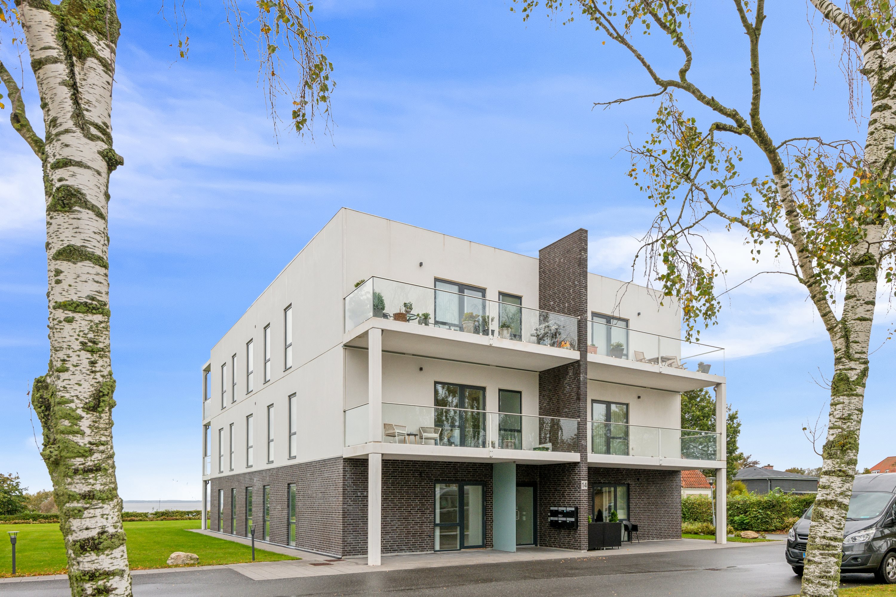 Et moderne hjem til parret eller familien. I træder indenfor i et hjem, der emmer af komfort og overskud. Kvalitet har været et nøgleord i opførelsen af ejendommen, og det mærker I tydeligt på jeres vej gennem lejligheden, hvor gode materialer går igen overalt – det samme gør gulvvarmen. I får en entré med indbygget skabsplads, tre fine værelser, et stilrent badeværelse med vaskesøjle og et åbent leverum, hvor det dejlige lys strømmer ind. Madlavningen foregår i et lækkert køkken, og sofaen kan placeres med udsigt til vandet. Velkommen hjem!