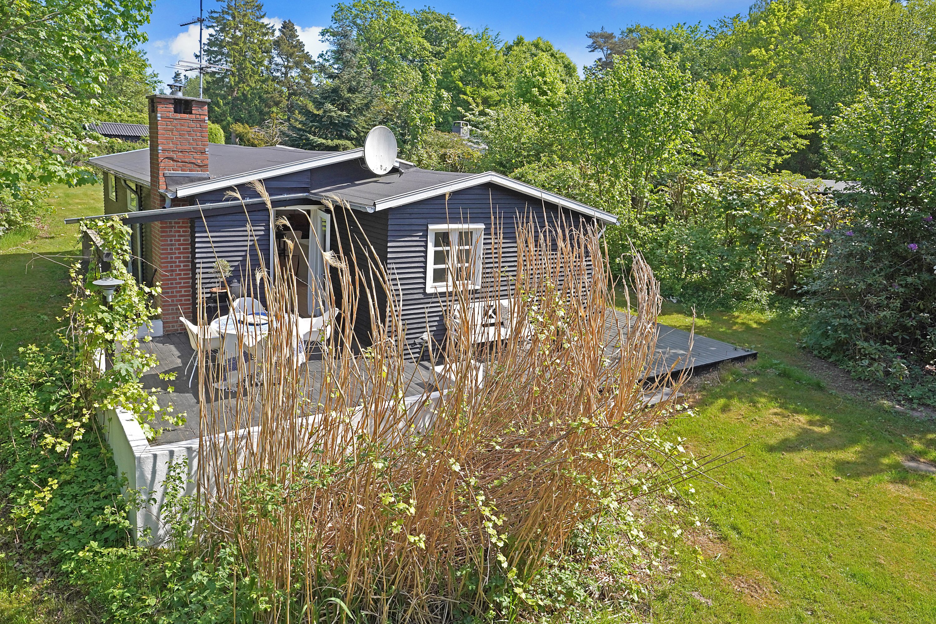 Sommerhuset er placeret midt på grunden, så der er en stor forhave hvor huset åbner sig og den store træterrasse byder velkommen. Baghaven er helt ugeneret og her er der god plads til udehygge og leg for hele familien.
