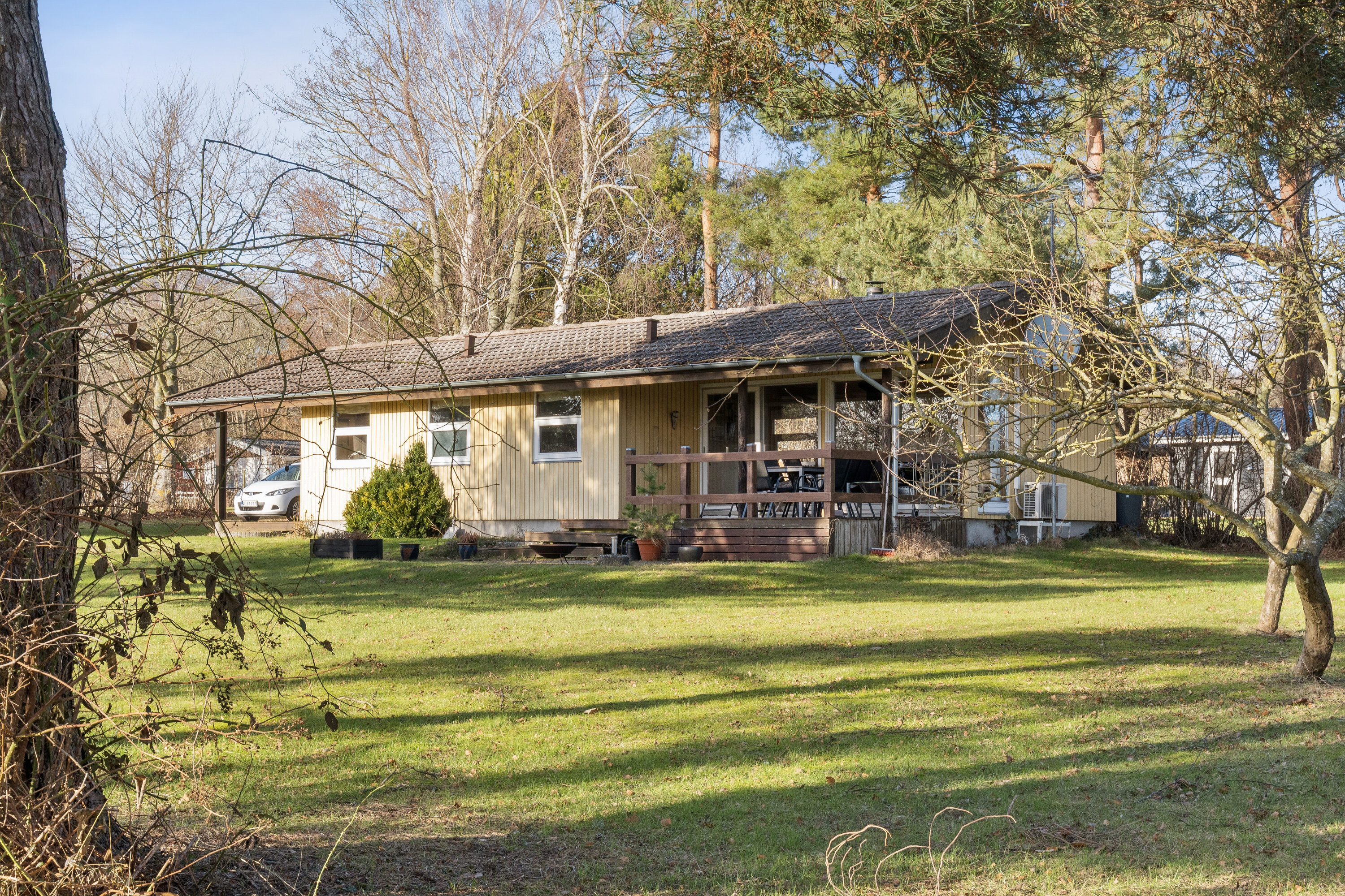 Grunden er virkelig skøn og danner en smuk, grøn ramme om huset. Den er omkranset af høje træer, som skaber både læ og privatliv, og ejendommen ligger godt trukket tilbage fra vejen, hvilket giver en særlig ro og ugeneret stemning. Her er plads til leg, boldspil, afslapning i solen og hyggelige stunder med familie og venner.