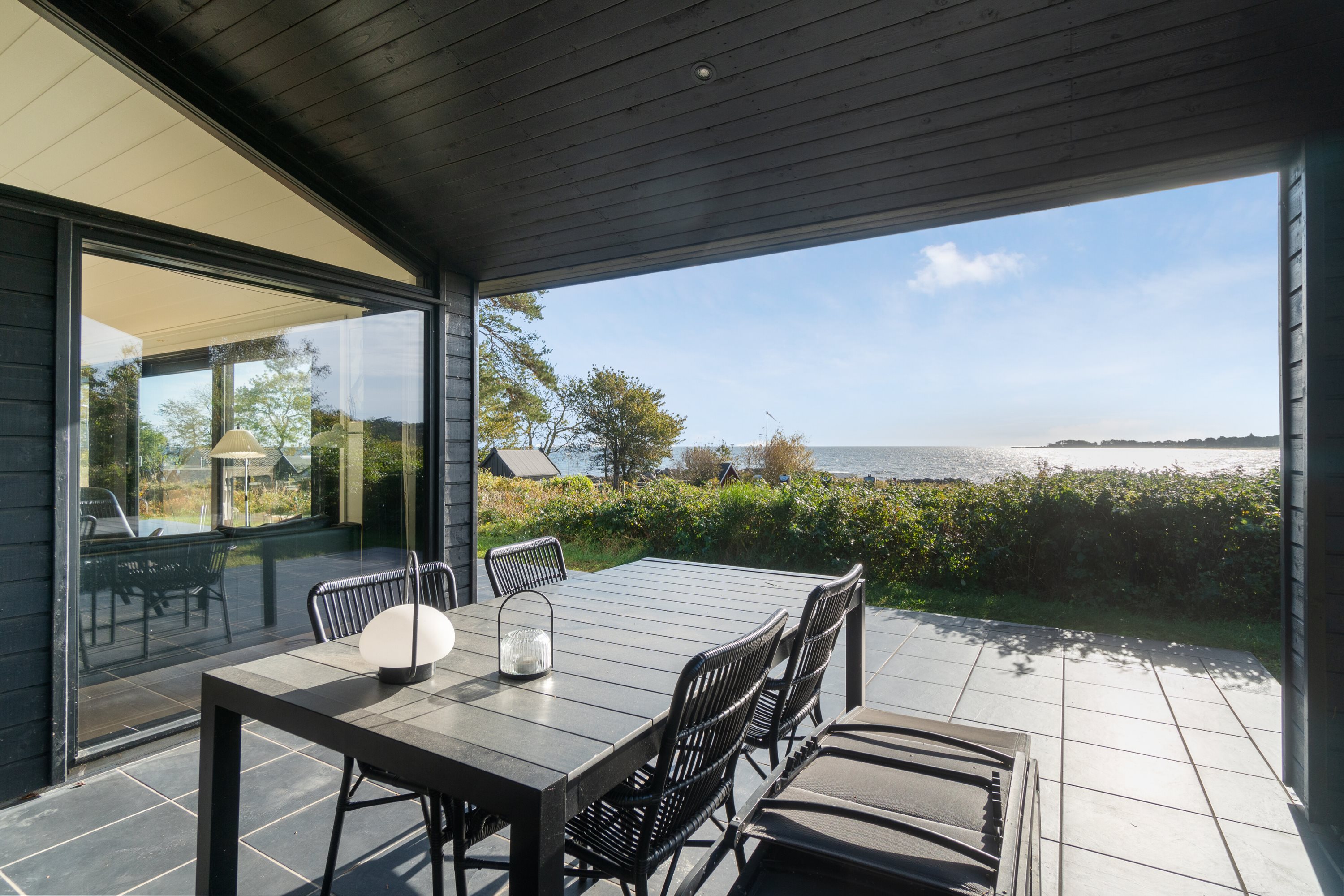 Udefra fremstår sommerhuset med en markant træfacade. De sortmalede brædder ledsages af store vinduespartier og et listetag. Inden døre er det lige præcis de nævnte vinduer, som sørger for at boligen især kendetegnes af et formidabelt lysindfald. Hertil ses et plankegulv og et raffineret, hvidt køkken med glatte fronter. Loftet er ført til kip, hvilket kun yderligere understreger den luftige, behagelige atmosfære.