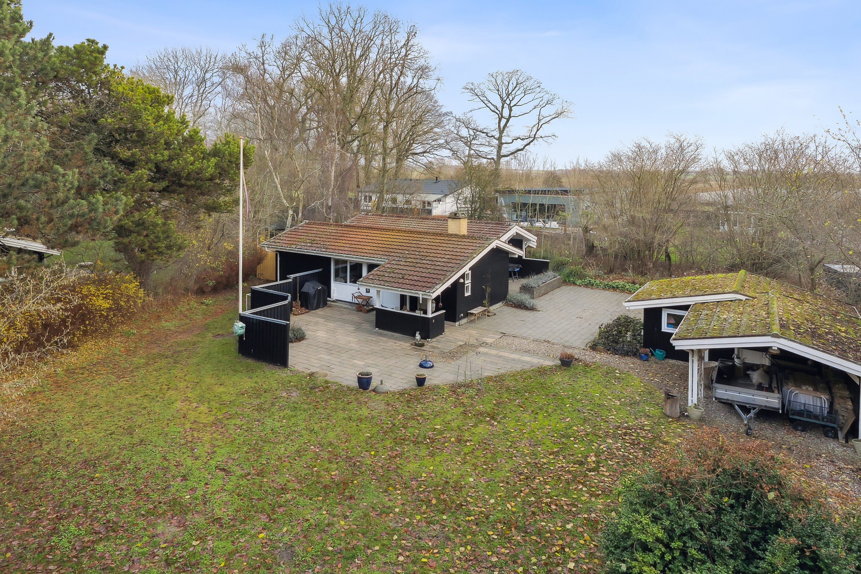 Morgen, middag og aften har I glæde af solen på terrassen. Terrassen omkranser nemlig det meste af husets sydside og skaber flere stemningsfulde kroge, hvor I også altid kan finde en plads i skyggen. Ligeledes færdes I ugeneret på den store, velbeplantede grund.
