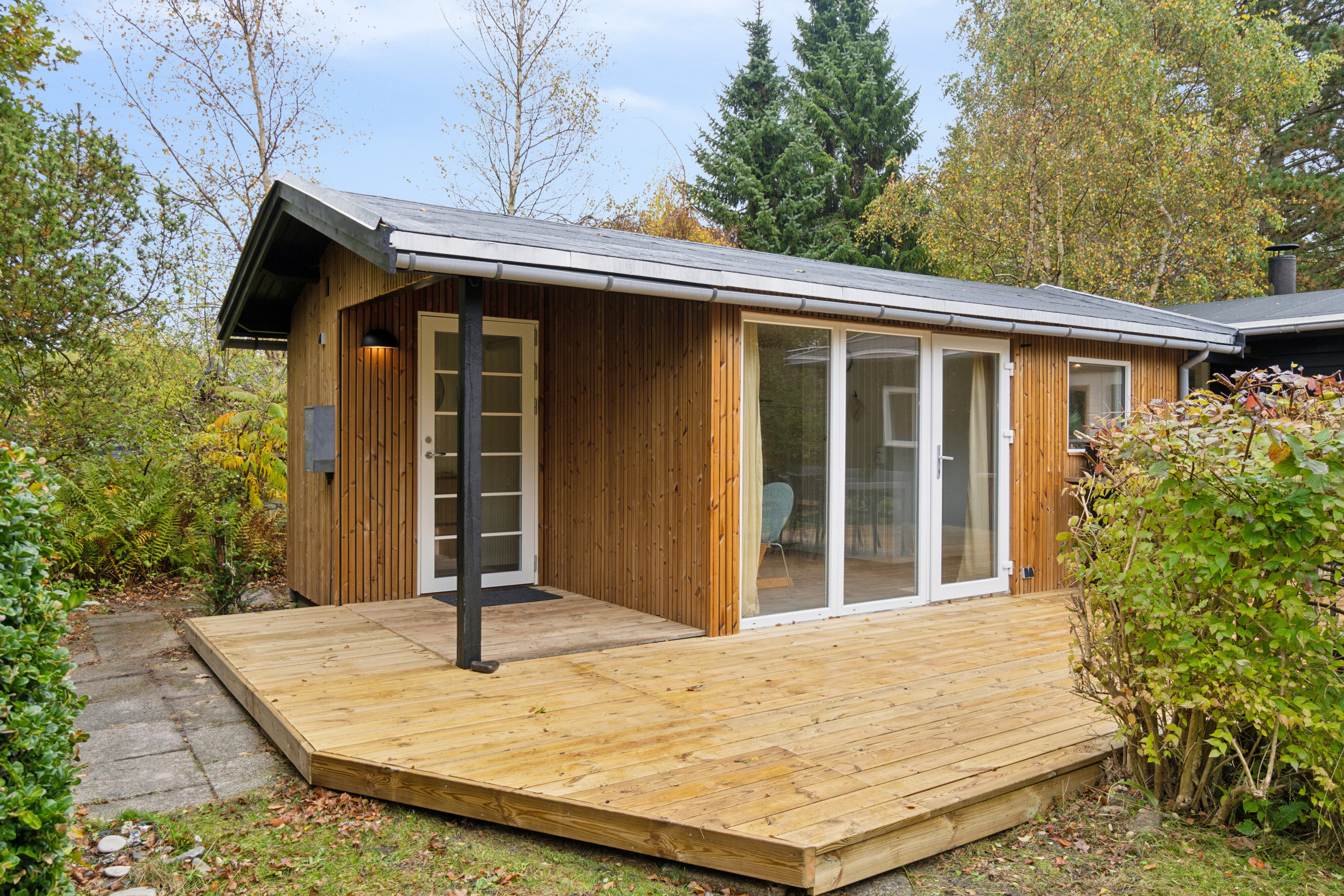 Udendørs indbyder en helt ny træterrasse til samvær og afslapning i solen. Grunden fremstår rå og enkel med store rododendronbuske, men giver samtidig den nye ejer mulighed for at forme efter egne ønsker - ideelt for dem med grønne fingre .