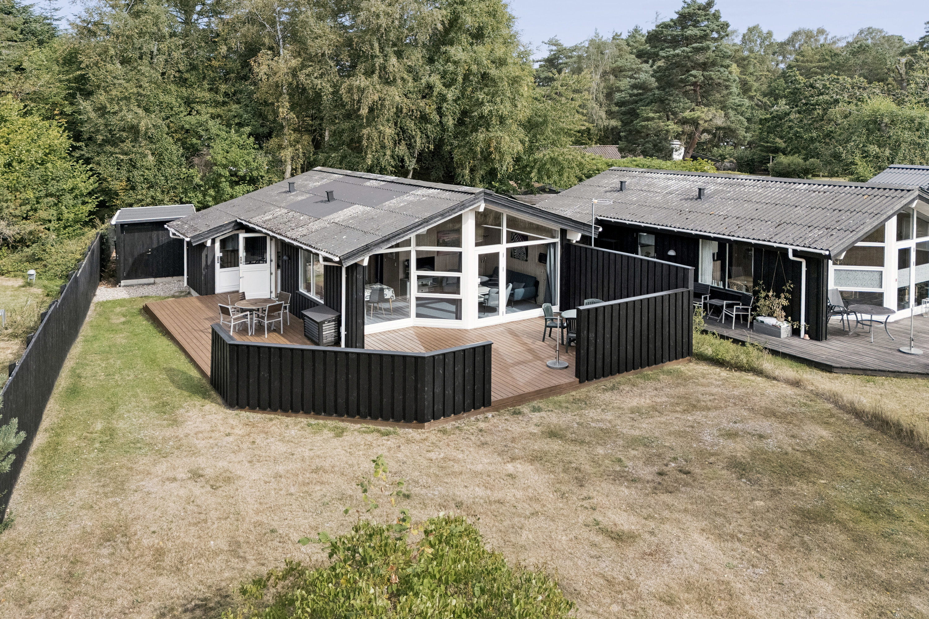 Boligen er opført i klassisk sommerhusstil med sort træfacade og store vinduespartier, der giver et flot lysindfald og en åben forbindelse mellem inde- og udeliv. Indenfor mødes du af en entré, der indleder husets funktionelle planløsning. Hjertet i boligen er alrummet, hvor køkken og opholdsrum smelter sammen og skaber et lyst og indbydende samlingspunkt. Køkkenet er praktisk indrettet med god skabsplads, mens der i alrummet er plads til både spisebord og sofagruppe.
