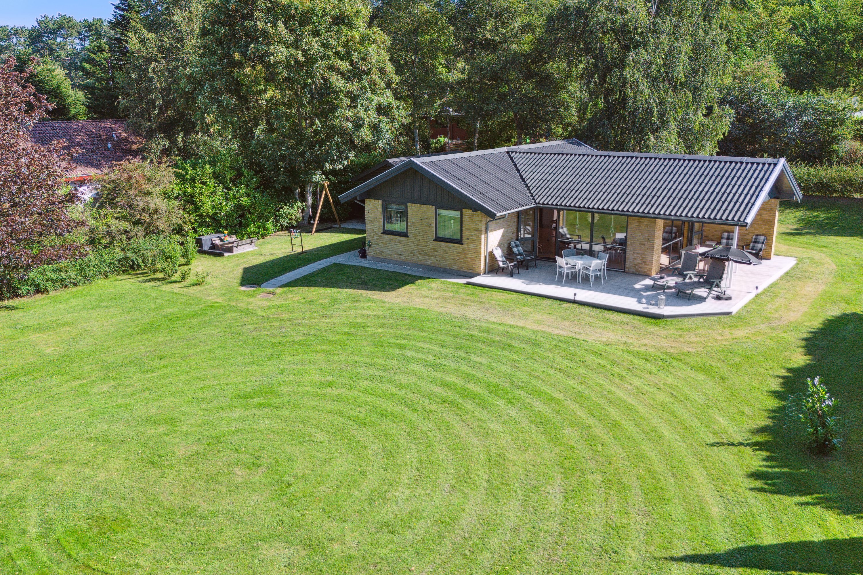 Tilbage på egen matrikel tilbyder den store, naturskønne og ugenerede grund masser af gode muligheder for leg og aktiviteter i solen for børnene, mens I indtager den vældige terrasse. Her kan I fange solen det meste af dagen alt efter placering, og den overdækkede del er eksempelvis oplagt til grillmiddagene. Det er også skønt med en udebruser, hvor strandsandet kan skylles af efter lange dage ved vandet. I forlængelse af terrassen har I et udhus med flere disponible rum samt et toilet med rum til vaskefaciliteter.