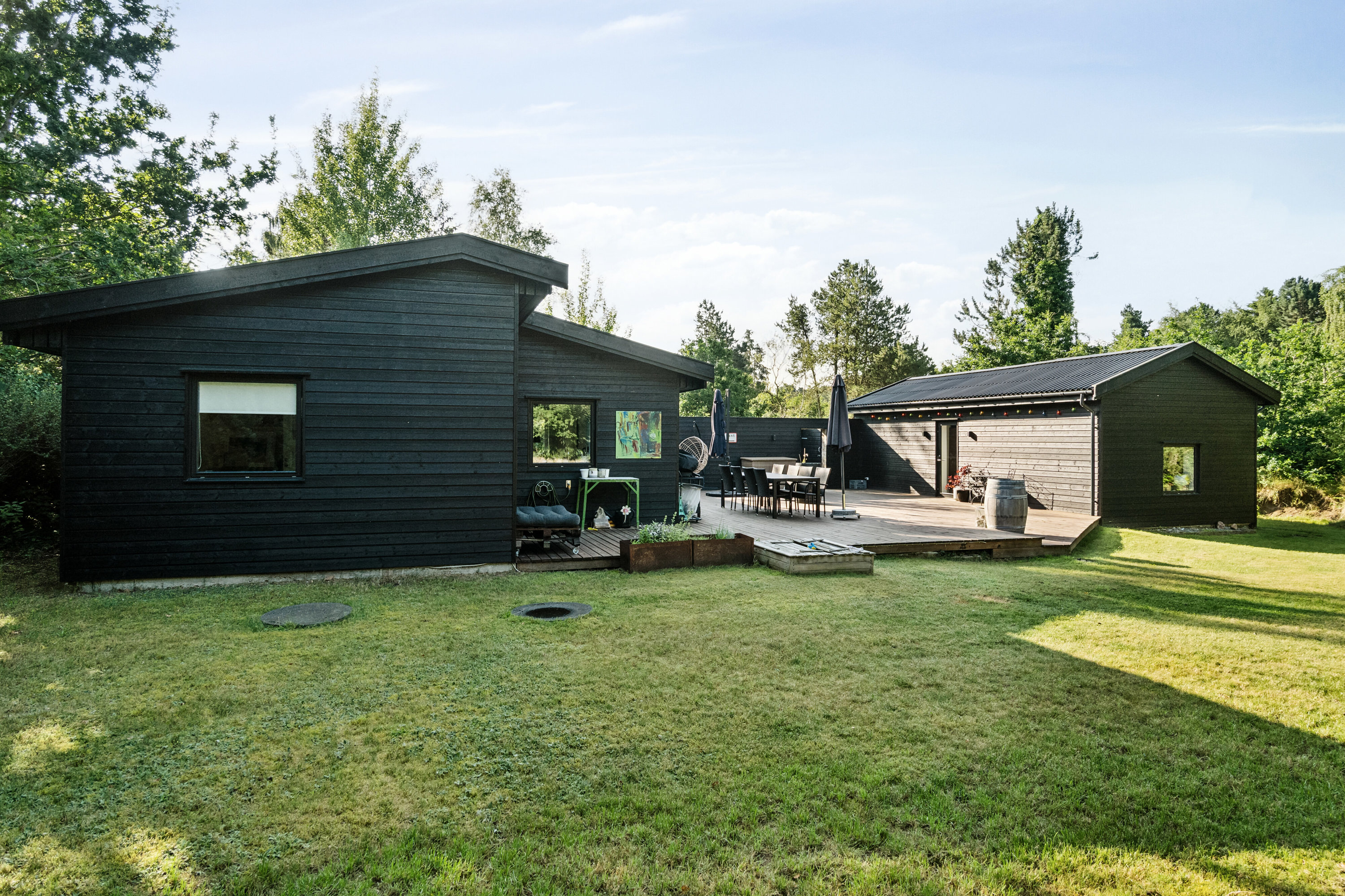 Hjemme på adressen ligger huset dejligt tilbagetrukket og er godt omkranset af beplantning, så naboer er ikke det første, I lægger mærke til. Særligt terrassen er skønt afskærmet, hvilket sikrer jer følelsen af privatliv og giver grundlag for en masse hyggelige stunder. Terrassen forbinder annekset og sommerhuset. Der er også græsplæne til leg, og så vender haven godt for solen.