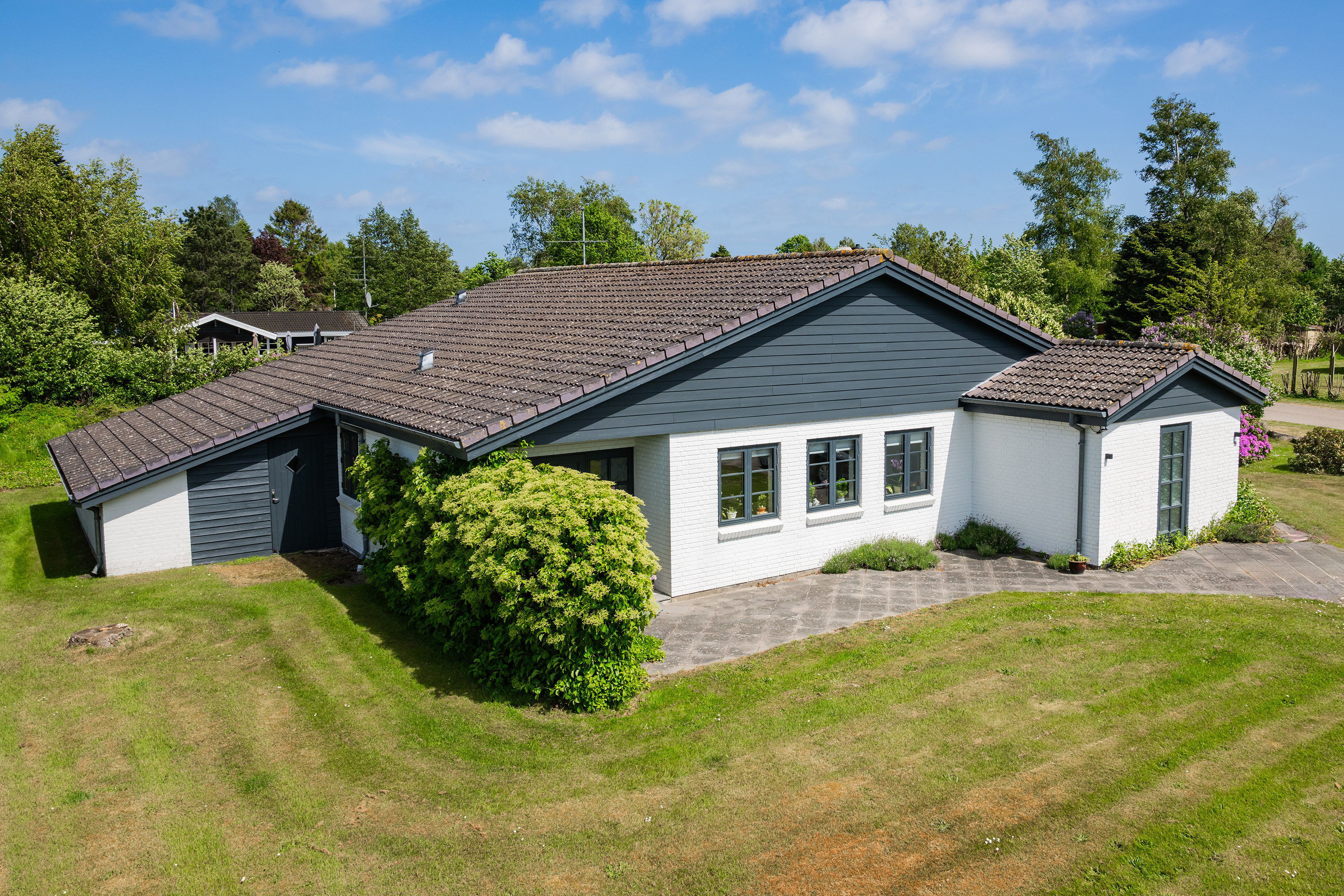 Indenfor byder boligen på en åben og lys planløsning, hvor køkken, spisestue og opholdsstue er naturligt forbundet. Loftshøjden i stuen skaber en luftig atmosfære, og de brede vinduespartier lader lyset strømme ind og giver en smuk forbindelse til haven og den skønne terrasse.