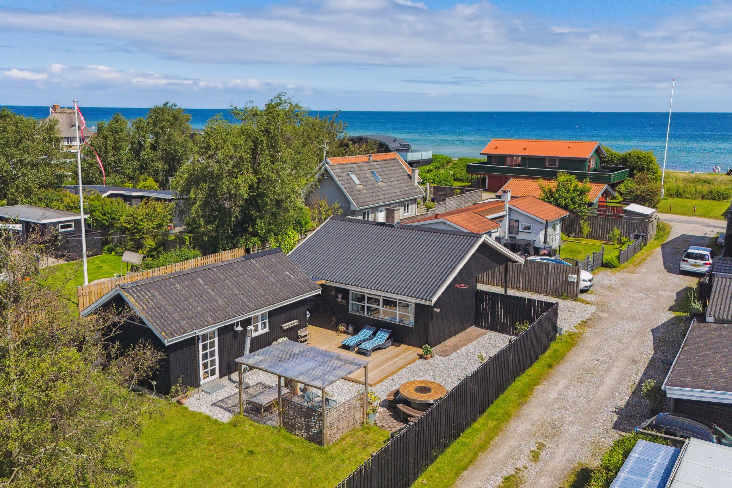 Som ud over sommerhusene og den fine terrasse også rummer et lille udhus (ikke godkendt til beboelse) og et skønt bål sted og fin pergola. Der er virkelig gjort noget ud af at skabe forskellige rum i haven – Og det fungerer bare!