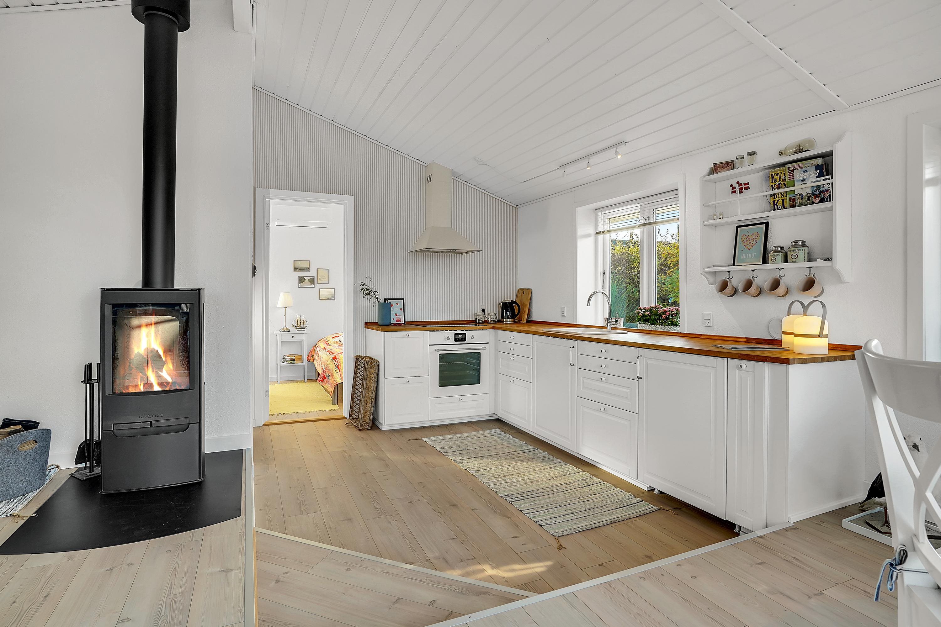 De store vinduespartier sørger ligeledes for at invitere flest mulig af solens stråler ind i opholdsmiljøet, hvor stue og køkken ligger ud i ét. Det sikrer en dejlig lys atmosfære i det store rum, som derudover skal fremhæves for sin brændeovn og den direkte udgang til den vestvendte del af ejendommens terrassemiljø.
