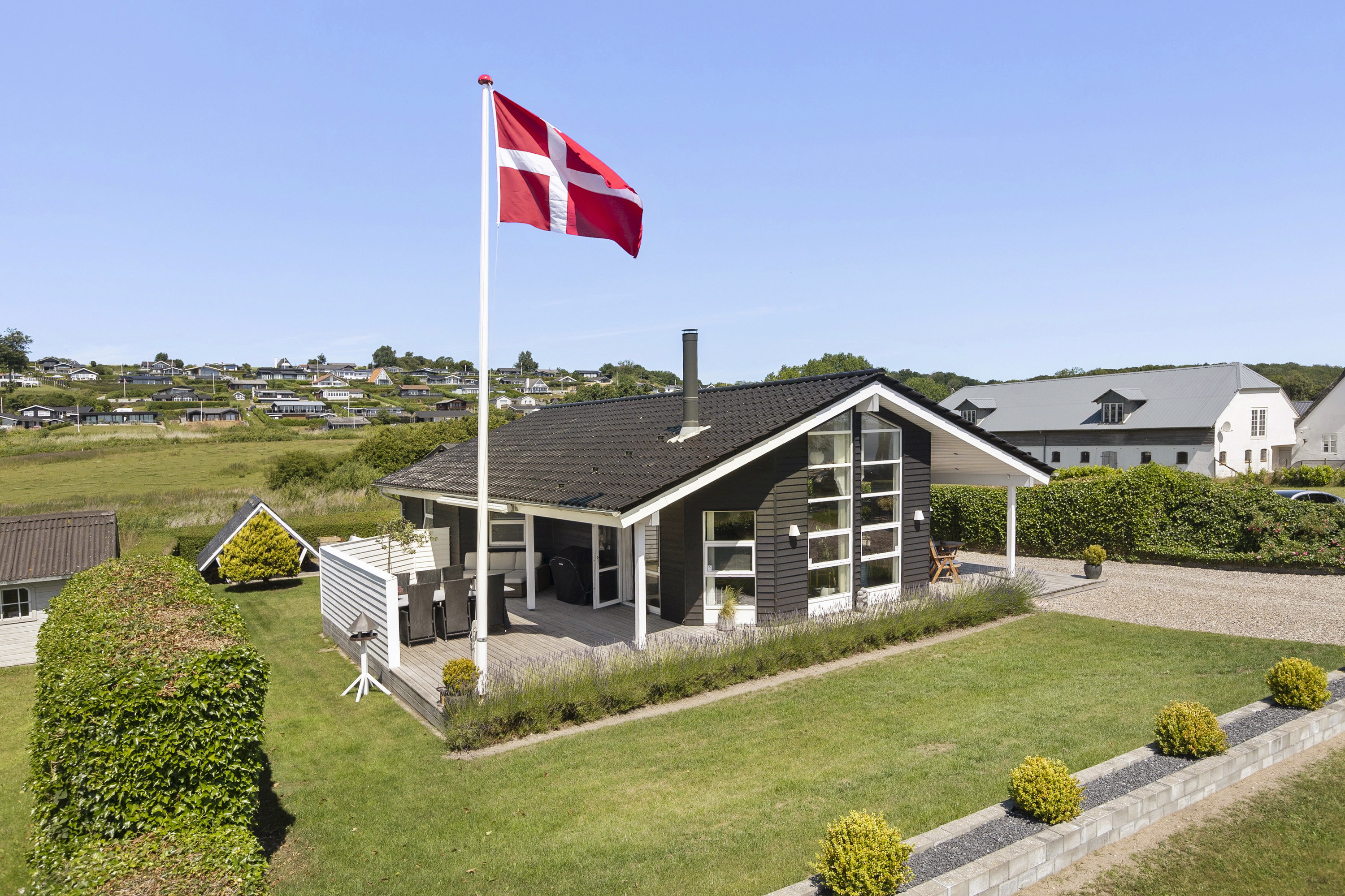 Den afvekslende udsigt kan I nyde inde fra stuen og udenfor på terrassen, der i øvrigt smyger sig hele vejen rundt om huset, så I altid kan finde et sted med sol efter skygge efter temperament, ligesom I kan glæde jeg over de fine muligheder for at finde et sted med læ. Udover terrassen og indkørslen får I et passende stort areal med plæne, men ellers er der ikke de store pasningsforpligtelser forbundet med denne meget praktiske sommerhusejendom.
