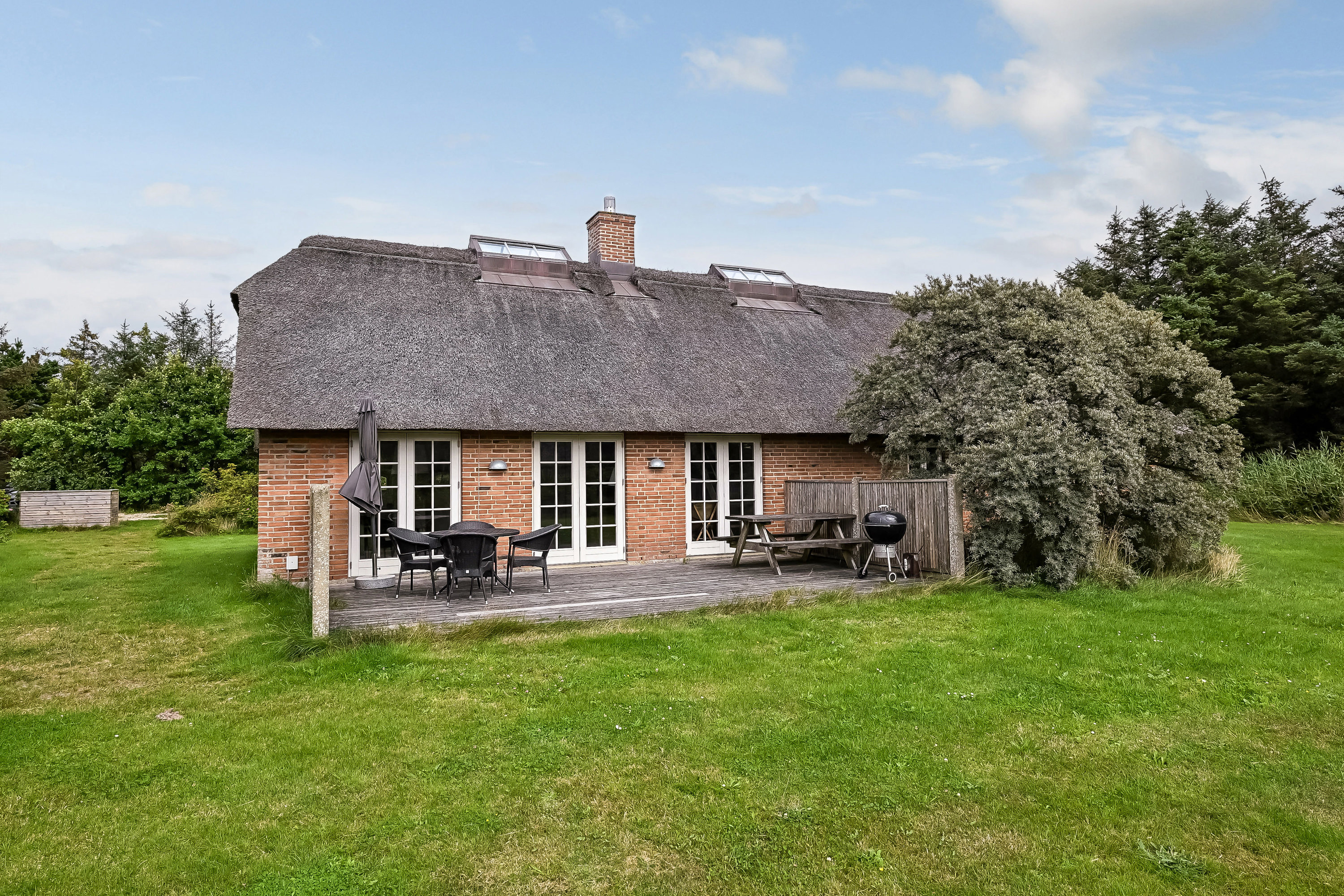 Fra stuen er der via fuldoplukkelige dobbeltdøre udgang til en sydvendt terrasse, hvor livet leves under åben himmel. Her kan morgenkaffen nydes til fuglesang, og når aftenen falder på, er der ikke noget bedre end at sætte sig med et glas vin og se solnedgangen.