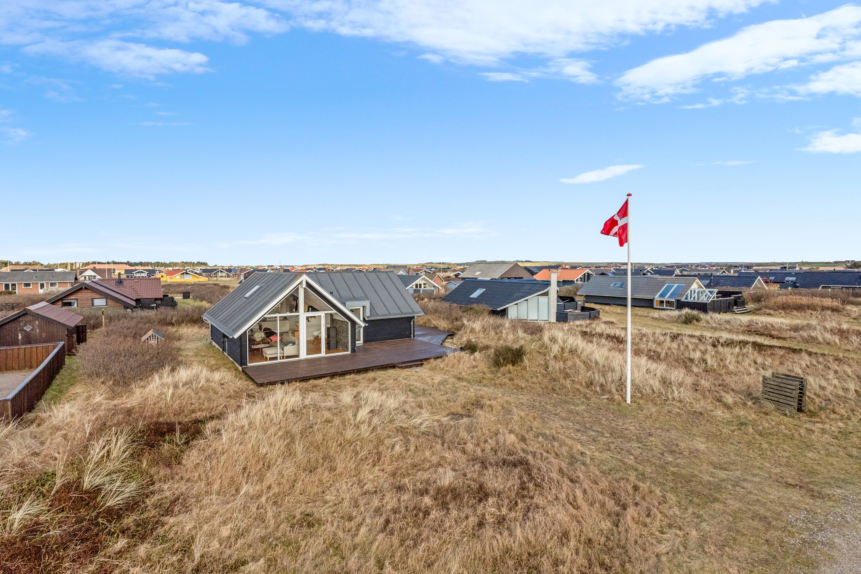 I hjertet af naturskønne omgivelser finder du dette indbydende fritidshus, der emmer af hygge og komfort. Med 76 kvadratmeter fordelt på to værelser og en lys stue, tilbyder huset en perfekt ramme for uforglemmelige stunder med familie og venner. De store vinduer i stuen skaber et fantastisk lysindfald og giver en vidunderlig udsigt til det omkringliggende landskab med klitter og rå natur, som du kan nyde fra den lækre træterrasse.