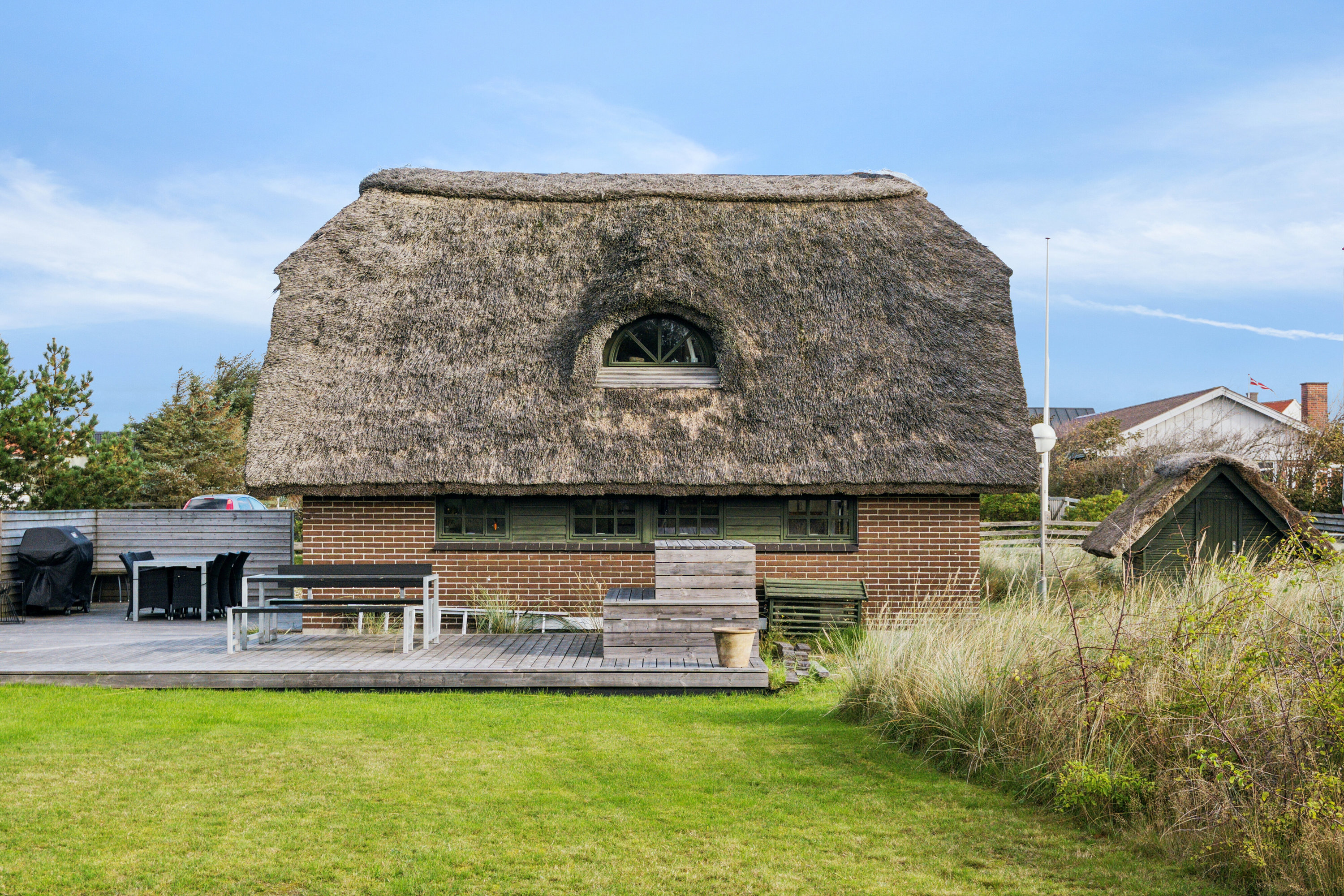 Sommerhuset er opført i 1974 og fremstår med facader i brune teglsten, stråtag fra 2009 (med branddug) samt trævinduer der løbende er udskiftet - naturligvis i den originale, grønne farve og med sprosser.