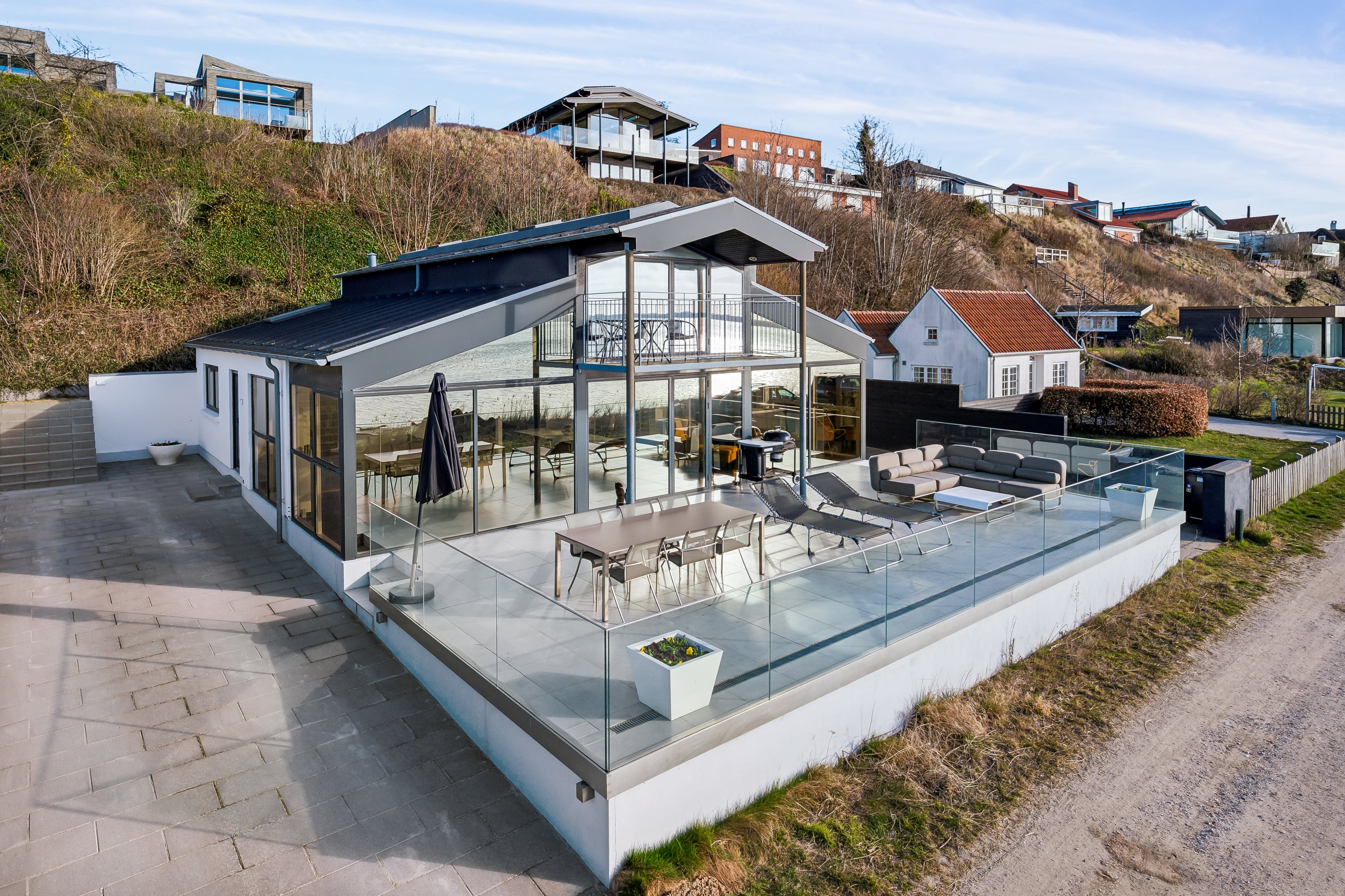 Med første parket til stranden er det let at hoppe i bølgen blå og derefter vende hjem, for du kan skylle saltvandet af under udendørsbruseren. Find dig til rette på den store, sydvendte terrasse, der er indrammet af glasrækværk, så du uforstyrret kan nyde panoramaudsigten over Aarhus Bugt. Et anneks giver plads til overnattende gæster eller opbevaring.